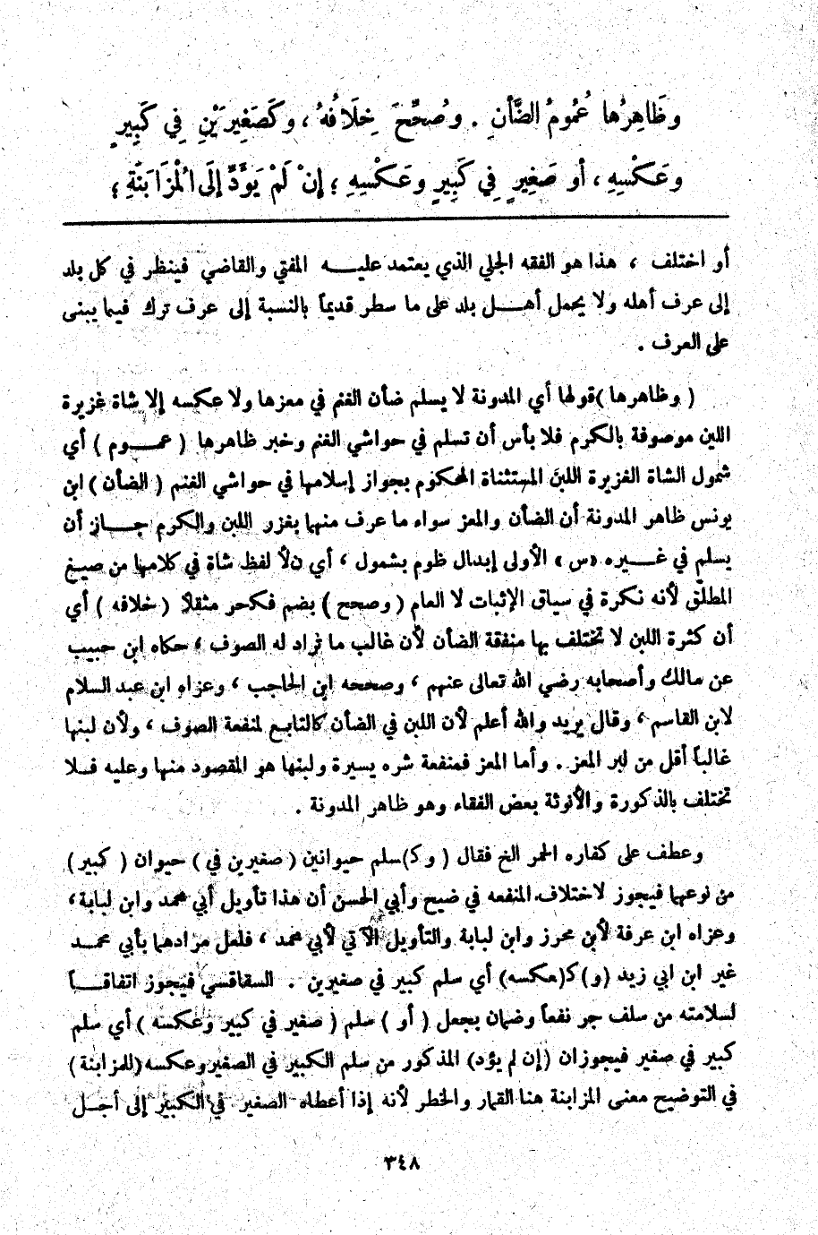 (وَظَاهِرُهَا) قَوْلُهَا أَيْ الْمُدَوَّنَةِ لَا يُسْلَمُ ضَأْنُ الْغَنَمِ فِي مَعْزِهَا وَلَا عَكْسُهُ إلَّا شَاةً غَزِيرَةَ اللَّبَنِ مَوْصُوفَةً بِالْكَرْمِ فَلَا بَأْسَ أَنْ تُسْلَمَ فِي حَوَاشِي الْغَنَمِ وَخَبَرُ ظَاهِرِهَا (عُمُومُ) أَيْ شُمُولُ الشَّاةِ الْغَزِيرَةِ اللَّبَنِ الْمُسْتَثْنَاةِ الْمَحْكُومِ بِجَوَازِ إسْلَامِهَا فِي حَوَاشِي الْغَنَمِ (الضَّأْنِ) ابْنُ يُونُسَ ظَاهِرُ الْمُدَوَّنَةِ أَنَّ الضَّأْنَ وَالْمَعْزَ سَوَاءٌ مَا عُرِفَ مِنْهُمَا بِغُزْرِ اللَّبَنِ وَالْكَرْمِ جَازَ أَنْ يُسْلَمَ فِي غَيْرِهِ " س " الْأَوْلَى إبْدَالُ عُمُومٍ بِشُمُولٍ، أَيْ لِأَنَّ لَفْظَ شَاةٍ فِي كَلَامِهَا مِنْ صِيَغِ الْمُطْلَقِ لِأَنَّهُ نَكِرَةٌ فِي سِيَاقِ الْإِثْبَاتِ لَا الْعَامِّ (وَصُحِّحَ) بِضَمٍّ فَكَسْرٍ مُثَقَّلًا (خِلَافُهُ) أَيْ أَنَّ كَثْرَةَ اللَّبَنِ لَا تَخْتَلِفُ بِهَا مَنْفَعَةُ الضَّأْنِ لِأَنَّ غَالِبَ مَا تُرَادُ لَهُ الصُّوفُ، حَكَاهُ ابْنُ حَبِيبٍ عَنْ مَالِكٍ وَأَصْحَابِهِ - رَضِيَ اللَّهُ تَعَالَى عَنْهُمْ - وَصَحَّحَهُ ابْنُ الْحَاجِبِ، وَعَزَاهُ ابْنُ عَبْدِ السَّلَامِ لِابْنِ الْقَاسِمِ، وَقَالَ يُرِيدُ وَاَللَّهُ أَعْلَمُ لِأَنَّ اللَّبَنَ فِي الضَّأْنِ كَالتَّابِعِ لِمَنْفَعَةِ الصُّوفِ وَلِأَنَّ لَبَنَهَا غَالِبًا أَقَلُّ مِنْ لَبَنِ الْمَعْزِ. وَأَمَّا الْمَعْزُ فَمَنْفَعَةُ شَعْرِهِ يَسِيرَةٌ وَلَبَنُهَا هُوَ الْمَقْصُودُ مِنْهَا وَعَلَيْهِ فَلَا تَخْتَلِفُ بِالذُّكُورَةِ وَالْأُنُوثَةِ بَعْضُ الْفُقَهَاءِ وَهُوَ ظَاهِرُ الْمُدَوَّنَةِ.