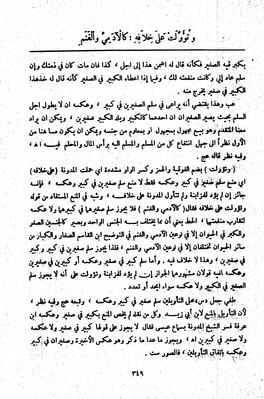 (وَتُؤُوِّلَتْ) بِضَمِّ الْفَوْقِيَّةِ وَالْهَمْزِ وَكَسْرِ الْوَاوِ مُشَدَّدَةً أَيْ حُمِلَتْ الْمُدَوَّنَةُ (عَلَى خِلَافِهِ) أَيْ مَنْعِ سَلَمِ صَغِيرٍ فِي كَبِيرٍ وَعَكْسِهِ فَقَطْ لَا مَنْعِ سَلَمِ صَغِيرَيْنِ فِي كَبِيرٍ وَعَكْسِهِ، فَإِنَّهُ جَائِزٌ إنْ لَمْ يُؤَدِّ لِلْمُزَابَنَةِ وَلَمْ تُتَأَوَّلْ الْمُدَوَّنَةُ عَلَى خِلَافِهِ