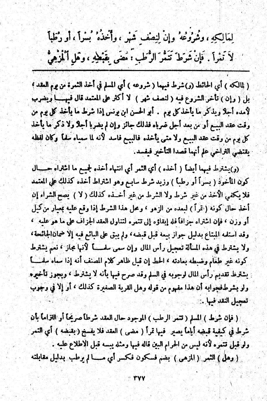 ـــــــــــــــــــــــــــــQلِمَالِكِهِ) أَيْ الْحَائِطِ (وَ) شُرِطَ فِيهِمَا (شُرُوعُهُ) أَيْ الْمُسْلِمِ فِي أَخْذِ الثَّمَرَةِ مِنْ يَوْمِ الْعَقْدِ، بَلْ (وَإِنْ) تَأَخَّرَ الشُّرُوعُ فِيهِ (لِنِصْفِ شَهْرٍ) لَا أَكْثَرَ عَلَى الْمُعْتَمَدِ قَالَ فِيهَا وَيَضْرِبُ لِأَمَدِهِ أَجَلًا وَيَذْكُرُ مَا يَأْخُذُ كُلَّ يَوْمٍ. أَبُو الْحَسَنِ ابْنُ يُونُسَ إذَا شَرَطَ مَا يَأْخُذُ كُلَّ يَوْمٍ مِنْ وَقْتِ عَقْدِ الْبَيْعِ أَوْ مِنْ بَعْدِ أَجَلٍ ضَرَبَاهُ فَذَلِكَ جَائِزٌ وَإِنْ لَمْ يَضْرِبَا أَجَلًا وَلَا ذَكَرَ مَا يَأْخُذُ كُلَّ يَوْمٍ مِنْ وَقْتِ عَقْدِ الْبَيْعِ وَلَا مَتَى يَأْخُذُهُ فَالْبَيْعُ فَاسِدٌ لِأَنَّهُ لَمَّا سَمَّيَاهُ سَلَمًا وَكَانَ لَفْظُهُ يَقْتَضِي التَّرَاخِيَ عُلِمَ أَنَّهُمَا قَصَدَا التَّأْخِيرَ فَيَفْسُدُ.