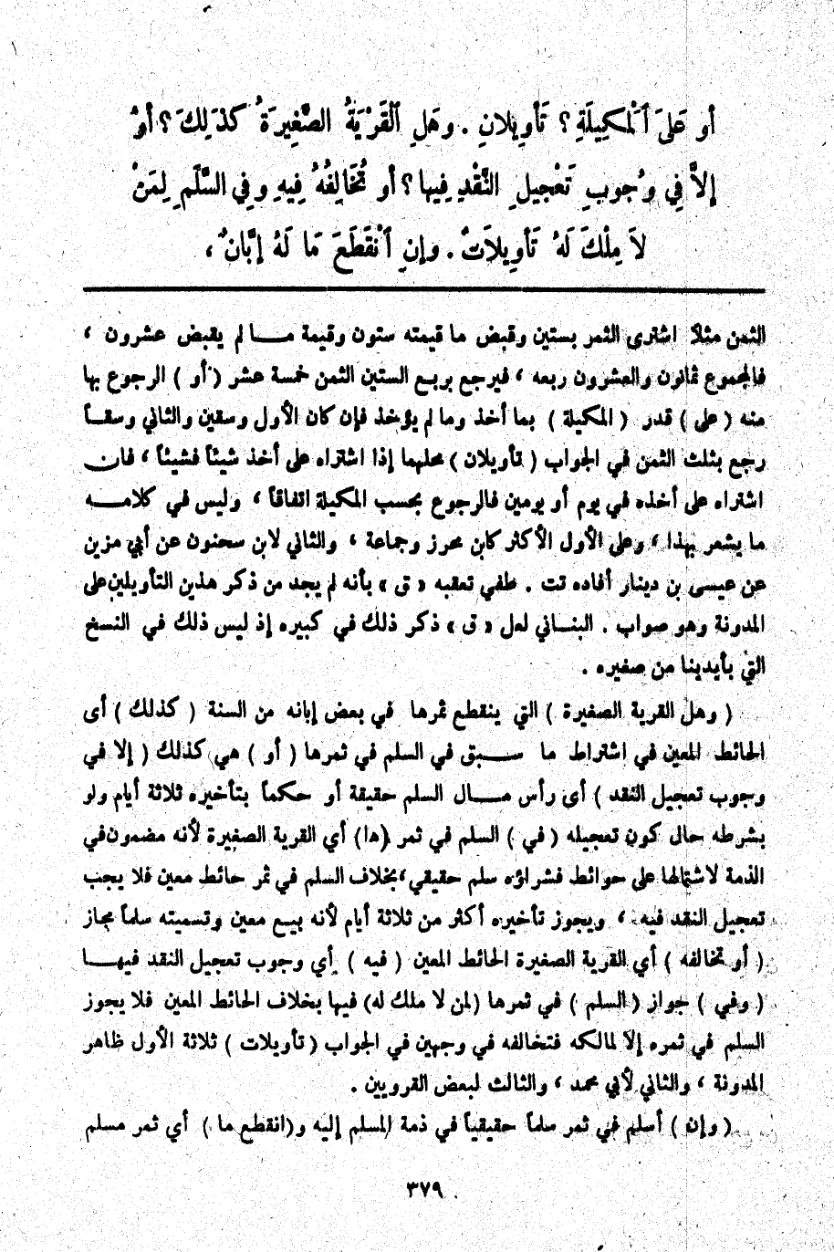 وَهَلْ الْقَرْيَةُ الصَّغِيرَةُ كَذَلِكَ؟ أَوْ إلَّا فِي وُجُوبِ تَعْجِيلِ النَّقْدِ فِيهَا؟ أَوْ تُخَالِفُهُ فِيهِ وَفِي السَّلَمِ لِمَنْ لَا مِلْكَ لَهُ تَأْوِيلَاتٌ.