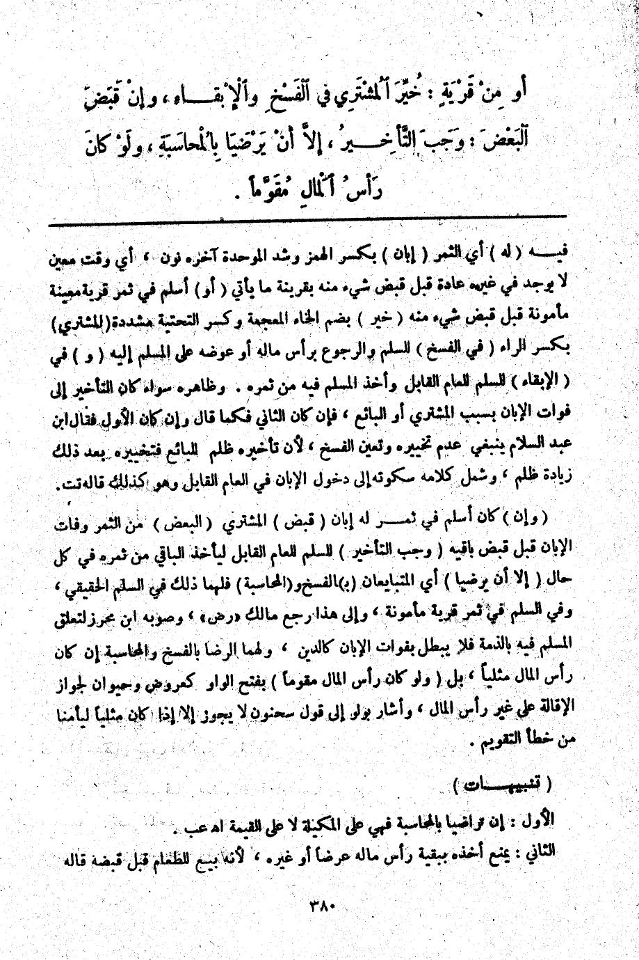 ـــــــــــــــــــــــــــــQفِيهِ (لَهُ) أَيْ الثَّمَرُ (إبَّانُ) بِكَسْرِ الْهَمْزِ وَشَدِّ الْمُوَحَّدَةِ آخِرُهُ نُونٌ، أَيْ وَقْتٌ مُعَيَّنٌ لَا يُوجَدُ فِي غَيْرِهِ عَادَةً قَبْلَ قَبْضِ شَيْءٍ مِنْهُ بِقَرِينَةِ مَا يَأْتِي (أَوْ) أَسْلَمَ فِي ثَمَرِ قَرْيَةٍ مُعَيَّنَةٍ مَأْمُونَةٍ قَبْلَ قَبْضِ شَيْءٍ مِنْهُ (خُيِّرَ) بِضَمِّ الْخَاءِ الْمُعْجَمَةِ وَكَسْرِ التَّحْتِيَّةِ مُشَدَّدَةً (الْمُشْتَرِي) بِكَسْرِ الرَّاءِ (فِي الْفَسْخِ) لِلسَّلَمِ وَالرُّجُوعِ بِرَأْسِ مَالِهِ أَوْ عِوَضِهِ عَلَى الْمُسْلَمِ إلَيْهِ (وَ) فِي (الْإِبْقَاءِ) لِلسَّلَمِ لِلْعَامِ الْقَابِلِ وَأَخْذِ الْمُسْلَمِ فِيهِ مِنْ ثَمَرِهِ. وَظَاهِرُهُ سَوَاءٌ كَانَ التَّأْخِيرُ إلَى فَوَاتِ الْإِبَّانِ بِسَبَبِ الْمُشْتَرِي أَوْ الْبَائِعِ، فَإِنْ كَانَ الثَّانِي فَكَمَا قَالَ وَإِنْ كَانَ الْأَوَّلُ فَقَالَ ابْنُ عَبْدِ السَّلَامِ يَنْبَغِي عَدَمُ تَخْيِيرِهِ وَتَعَيَّنَ الْفَسْخُ لِأَنَّ تَأْخِيرَهُ ظُلْمٌ لِلْبَائِعِ فَتَخْيِيرُهُ بَعْدَ ذَلِكَ زِيَادَةُ ظُلْمٍ، وَشَمِلَ كَلَامُهُ سُكُوتَهُ إلَى دُخُولِ الْإِبَّانِ فِي الْعَامِ الْقَابِلِ وَهُوَ كَذَلِكَ قَالَهُ تت.
