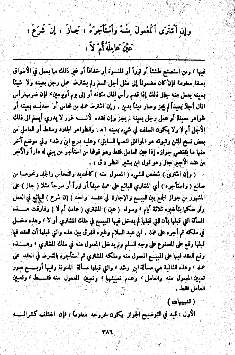 (وَإِنْ اشْتَرَى) شَخْصٌ الشَّيْءَ (الْمَعْمُولَ مِنْهُ) كَالْحَدِيدِ وَالنُّحَاسِ وَالْجِلْدِ وَنَحْوِهَا مِنْ صَانِعٍ (وَاسْتَأْجَرَهُ) أَيْ الْمُشْتَرِي الْبَائِعَ عَلَى عَمَلِهِ سَيْفًا أَوْ تَوْرًا أَوْ سَرْجًا مَثَلًا (جَازَ) عَلَى الْمَشْهُورِ مِنْ جَوَازِ الْجَمْعِ بَيْنَ الْبَيْعِ وَالْإِجَارَةِ فِي عَقْدٍ وَاحِدٍ (إنْ شَرَعَ) الْبَائِعُ فِي الْعَمَلِ وَلَوْ حُكْمًا بِتَأْخِيرِهِ ثَلَاثَةَ أَيَّامٍ، وَسَوَاءٌ (عَيَّنَ) الْمُشْتَرِي (عَامِلَهُ أَمْ لَا) وَفَارَقَتْ هَذِهِ الْمَسْأَلَةُ الَّتِي قَبْلَهَا بِأَنَّ الَّتِي قَبْلَهَا لَمْ يَدْخُلْ فِيهَا الْمَبِيعُ فِي مِلْكِ الْمُشْتَرِي أَوَّلًا، وَهَذِهِ دَخَلَ فِي مِلْكِهِ ثُمَّ أَجَرَهُ عَلَى عَمَلِهِ ابْنُ عَبْدِ السَّلَامِ وَغَيْرُهُ الْفَرْقُ بَيْنَ هَذِهِ وَاَلَّتِي قَبْلَهَا أَنَّ الْعَقْدَ فِيمَا قَبْلَهَا وَقَعَ عَلَى الْمَصْنُوعِ عَلَى وَجْهِ السَّلَمِ وَلَمْ يَدْخُلْ الْمَعْمُولُ مِنْهُ فِي مِلْكِ الْمُشْتَرِي، وَهَذِهِ وَقَعَ الْعَقْدُ فِيهَا عَلَى الْمَبِيعِ الْمَعْمُولِ مِنْهُ وَمَلَكَهُ الْمُشْتَرِي ثُمَّ اسْتَأْجَرَهُ بِالشَّرْطِ فِي الْعَقْدِ عَلَى عَمَلِهِ، وَهَذِهِ الثَّانِيَةُ هِيَ مَسْأَلَةُ ابْنِ رُشْدٍ، وَاَلَّتِي قَبْلَهَا مَسْأَلَةُ الْمُدَوَّنَةِ وَفِيهَا أَرْبَعُ صُوَرٍ تَعْيِينُ الْمَعْمُولِ مِنْهُ وَالْعَامِلِ، وَعَدَمُ تَعْيِينِهِمَا، وَتَعْيِينُ الْمَعْمُولِ مِنْهُ فَقَطْ، وَتَعْيِينُ الْعَامِلِ فَقَطْ.
