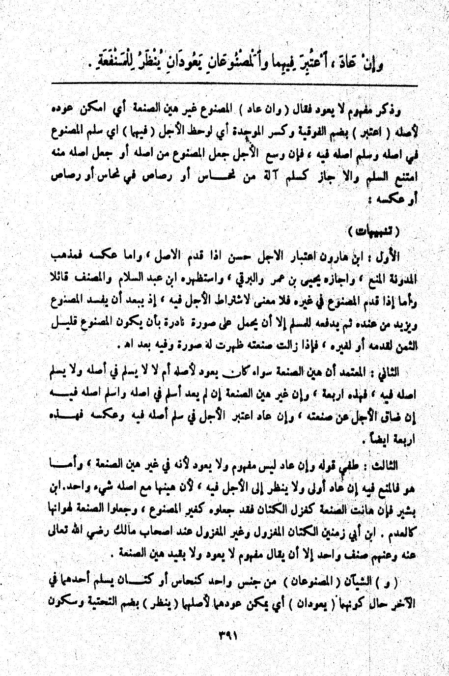 ـــــــــــــــــــــــــــــQوَذَكَرَ مَفْهُومَ لَا يَعُودُ فَقَالَ (وَإِنْ عَادَ) الْمَصْنُوعُ غَيْرَ هَيِّنِ الصَّنْعَةِ أَيْ أَمْكَنَ عَوْدُهُ لِأَصْلِهِ (اُعْتُبِرَ) بِضَمِّ الْفَوْقِيَّةِ وَكَسْرِ الْمُوَحَّدَةِ أَيْ لُوحِظَ الْأَجَلُ (فِيهِمَا) أَيْ سَلَمِ الْمَصْنُوعِ فِي أَصْلِهِ وَسَلَمِ أَصْلِهِ فِيهِ، فَإِنْ وَسِعَ الْأَجَلُ جُعِلَ الْمَصْنُوعُ مِنْ أَصْلِهِ أَوْ جُعِلَ أَصْلُهُ مِنْهُ امْتَنَعَ السَّلَمُ وَإِلَّا جَازَ كَسَلَمِ آلَةٍ مِنْ نُحَاسٍ أَوْ رَصَاصٍ فِي نُحَاسٍ أَوْ رَصَاصٍ أَوْ عَكْسِهِ.