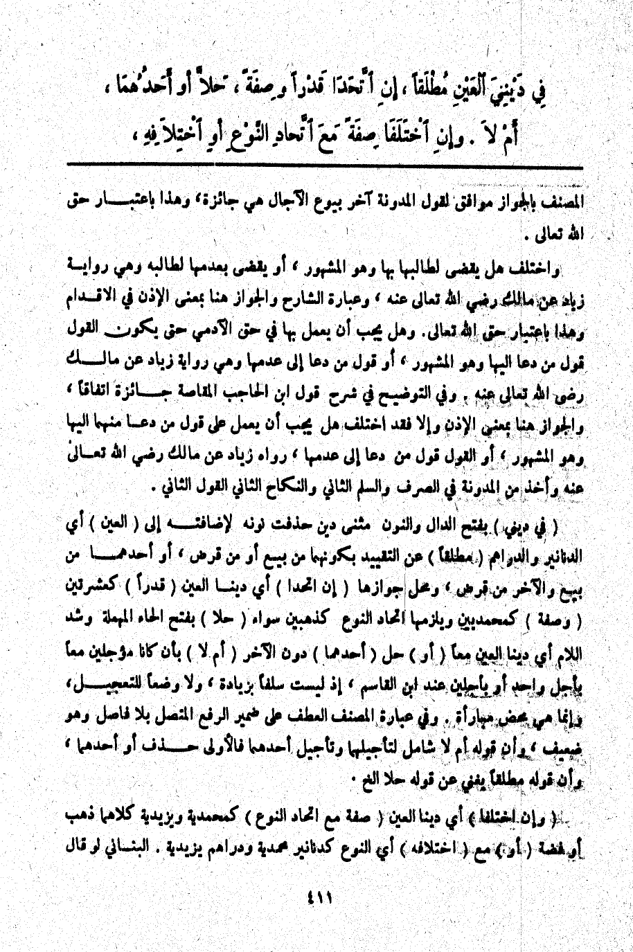 (فِي دَيْنَيْ) بِفَتْحِ الدَّالِ وَالنُّونِ مَثْنَى دَيْنٍ حُذِفَتْ نُونُهُ لِإِضَافَتِهِ إلَى (الْعَيْنِ) أَيْ الدَّنَانِيرِ وَالدَّرَاهِمِ (مُطْلَقًا) عَنْ التَّقْيِيدِ بِكَوْنِهِمَا مِنْ بَيْعٍ أَوْ مِنْ قَرْضٍ، أَوْ أَحَدُهُمَا مِنْ بَيْعٍ وَالْآخَرُ مِنْ قَرْضٍ، وَمَحَلُّ جَوَازِهَا (أَنَّهُ اتَّحِدَا) أَيْ دَيْنَا الْعَيْنِ (قَدْرًا) كَعَشَرَتَيْنِ (وَصِفَةً) كَمُحَمَّدِيَّيْنِ وَيَلْزَمُهَا اتِّحَادُ النَّوْعِ كَذَهَبَيْنِ سَوَاءٌ (حَلَّا) بِفَتْحِ الْحَاءِ الْمُهْمَلَةِ وَشَدِّ اللَّامِ أَيْ دَيْنَا الْعَيْنِ مَعًا (أَوْ) حَلَّ (أَحَدُهُمَا) دُونَ الْآخَرِ (أَمْ لَا) بِأَنْ كَانَا مُؤَجَّلَيْنِ مَعًا بِأَجَلٍ وَاحِدٍ أَوْ بِأَجَلَيْنِ عِنْدَ ابْنِ الْقَاسِمِ، إذْ لَيْسَتْ سَلَفًا بِزِيَادَةٍ، وَلَا وُضِعَا لِلتَّعْجِيلِ، وَإِنَّمَا هِيَ مَحْضُ مُبَارَأَةٍ. وَفِي عِبَارَةِ الْمُصَنِّفِ الْعَطْفُ عَلَى ضَمِيرِ الرَّفْعِ الْمُتَّصِلِ بِلَا فَاصِلٍ وَهُوَ ضَعِيفٌ، وَأَنَّ قَوْلَهُ أَمْ لَا شَامِلٌ لِتَأْجِيلِهِمَا وَتَأْجِيلِ أَحَدِهِمَا فَالْأَوْلَى حَذْفٌ أَوْ أَحَدُهُمَا، وَإِنَّ قَوْلَهُ مُطْلَقًا يُغْنِي عَنْ قَوْلِهِ حَلَّا إلَخْ.