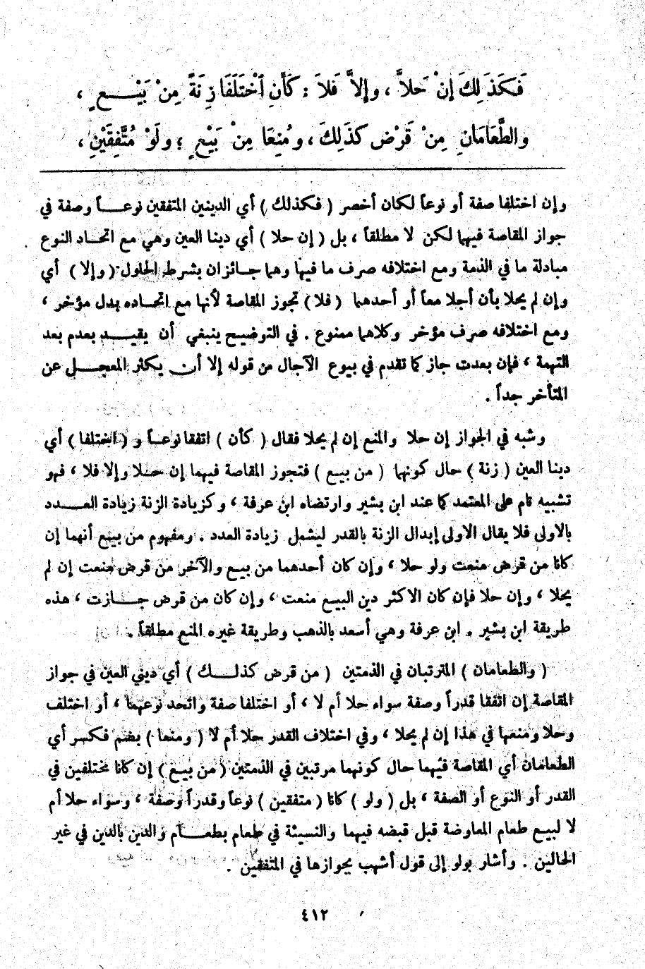 ـــــــــــــــــــــــــــــQوَإِنْ اخْتَلَفَا صِفَةً أَوْ نَوْعًا لَكَانَ أَخْصَرَ (فَكَذَلِكَ) أَيْ الدَّيْنَيْنِ الْمُتَّفِقَيْنِ نَوْعًا وَصِفَةً فِي جَوَازِ الْمُقَاصَّةِ فِيهِمَا لَكِنْ لَا مُطْلَقًا، بَلْ (إنْ حَلَّا) أَيْ دَيْنَا الْعَيْنِ وَهِيَ مَعَ اتِّحَادِ النَّوْعِ مُبَادَلَةُ مَا فِي الذِّمَّةِ وَمَعَ اخْتِلَافِهِ صَرْفُ مَا فِيهَا وَهُمَا جَائِزَانِ بِشَرْطِ الْحُلُولِ (وَإِلَّا) أَيْ وَإِنْ لَمْ يَحِلَّا بِأَنْ أَجَّلَا مَعًا أَوْ أَحَدَهُمَا (فَلَا) تَجُوزُ الْمُقَاصَّةُ لِأَنَّهَا مَعَ اتِّحَادِهِ بَدَلٌ مُؤَخَّرٌ، وَمَعَ اخْتِلَافِهِ صَرْفُ مُؤَخَّرٍ وَكِلَاهُمَا مَمْنُوعٌ. فِي التَّوْضِيحِ يَنْبَغِي أَنْ يُقَيِّدَ بِعَدَمِ بُعْدِ التُّهْمَةِ، فَإِنْ بَعُدَتْ جَازَ كَمَا تَقَدَّمَ فِي بُيُوعِ الْآجَالِ مِنْ قَوْلِهِ إلَّا أَنْ يَكْثُرَ الْمُعَجَّلُ عَنْ الْمُتَأَخِّرِ جِدًّا.