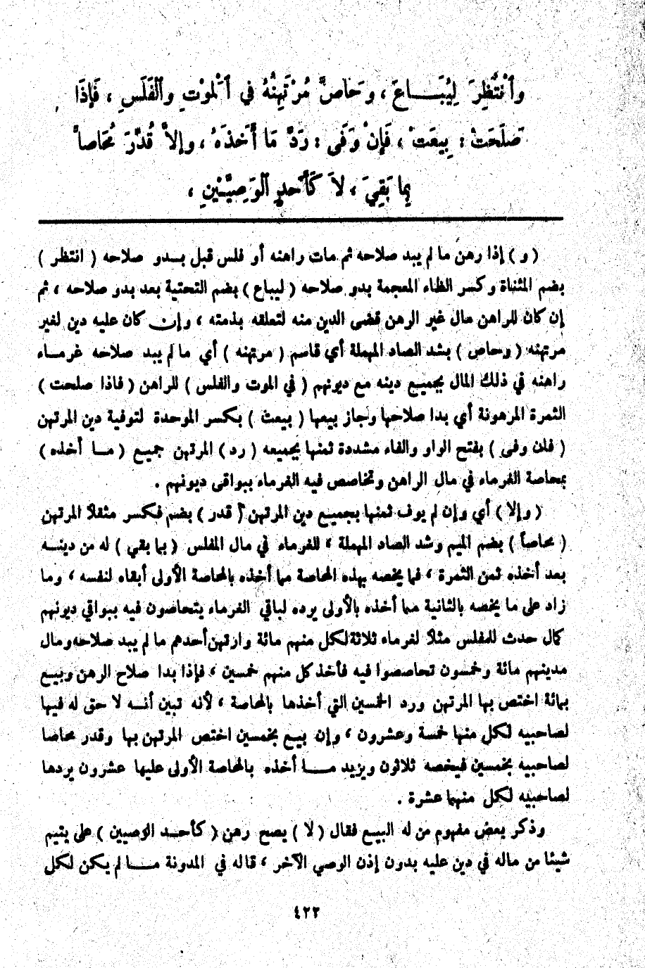 ـــــــــــــــــــــــــــــQوَ) إذَا رَهَنَ مَا لَمْ يَبْدُ صَلَاحُهُ ثُمَّ مَاتَ رَاهِنُهُ أَوْ فُلِّسَ قَبْلَ بُدُوِّ صَلَاحِهِ (اُنْتُظِرَ) بِضَمِّ الْمُثَنَّاةِ وَكَسْرِ الظَّاءِ الْمُعْجَمَةِ بُدُوُّ صَلَاحِهِ (لِيُبَاعَ) بِضَمِّ التَّحْتِيَّةِ بَعْدَ بُدُوِّ صَلَاحِهِ، ثُمَّ إنْ كَانَ لِلرَّاهِنِ مَالٌ غَيْرُ الرَّهْنِ قَضَى الدَّيْنَ مِنْهُ لِتَعَلُّقِهِ بِذِمَّتِهِ، وَإِنْ كَانَ عَلَيْهِ دَيْنٌ لِغَيْرِ مُرْتَهِنِهِ (وَحَاصَّ) بِشَدِّ الصَّادِ الْمُهْمَلَةِ أَيْ قَاسَمَ (مُرْتَهِنَهُ) أَيْ مَا لَمْ يَبْدُ صَلَاحُهُ غُرَمَاءُ رَاهِنِهِ فِي ذَلِكَ الْمَالِ بِجَمِيعِ دَيْنِهِ مَعَ دُيُونِهِمْ (فِي الْمَوْتِ وَالْفَلَسِ) لِلرَّاهِنِ (فَإِذَا صَلُحَتْ) الثَّمَرَةُ الْمَرْهُونَةُ أَيْ بَدَا صَلَاحُهَا وَجَازَ بَيْعُهَا (بِيعَتْ) بِكَسْرِ الْمُوَحَّدَةِ لِتَوْفِيَةِ دَيْنِ الْمُرْتَهِنِ (فَإِنْ وَفَّى) بِفَتْحِ الْوَاوِ وَالْفَاءِ مُشَدَّدَةً ثَمَنُهَا بِجَمِيعِهِ (رَدَّ) الْمُرْتَهِنُ جَمِيعَ (مَا أَخَذَهُ) بِمُحَاصَّةِ الْغُرَمَاءِ فِي مَالِ الرَّاهِنِ وَتَحَاصَصَ فِيهِ الْغُرَمَاءُ بِبَوَاقِي دُيُونِهِمْ.