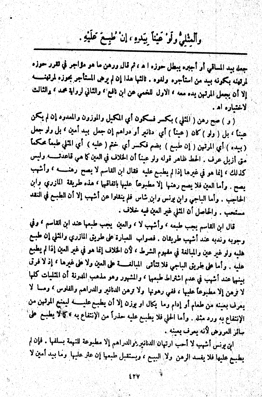 قَالَ ابْنُ الْقَاسِمِ يَجِبُ طَبْعُهُ وَأَشْهَبُ لَا، وَالْعَيْنُ يَجِبُ طَبْعُهَا عِنْدَ ابْنِ الْقَاسِمِ، وَفِي وُجُوبِهِ وَنَدْبِهِ عِنْدَ أَشْهَبَ طَرِيقَانِ. فَصَوَابُ الْعِبَارَةِ عَلَى طَرِيقِ الْمَازِرِيِّ وَالْمِثْلِيُّ إنْ طُبِعَ عَلَيْهِ وَلَوْ غَيْرَ عَيْنٍ وَالْمُبَالَغَةُ فِي مَفْهُومِ الشَّرْطِ لِأَنَّ الْخِلَافَ إنَّمَا هُوَ فِي غَيْرِ الْعَيْنِ إذَا لَمْ يُطْبَعْ عَلَيْهِ. وَأَمَّا عَلَى طَرِيقِ الْبَاجِيَّ فَلَا تَتَأَتَّى الْمُبَالَغَةُ عَلَى الْعَيْنِ وَلَا عَلَى غَيْرِهَا، إذْ لَا فَرْقَ بَيْنَهُمَا عِنْدَ أَشْهَبَ فِي عَدَمِ اشْتِرَاطِ طَبْعِهِمَا وَالْمَشْهُورُ وَهُوَ مَذْهَبُ الْمُدَوَّنَةِ أَنَّ الْمِثْلِيَّاتِ كُلَّهَا لَا تُرْهَنُ إلَّا مَطْبُوعًا عَلَيْهَا، فَفِي رُهُونِهَا وَلَا تُرْهَنُ الدَّنَانِيرُ إلَّا أَنْ يُطْبَعَ عَلَيْهِ لِيَمْنَعَ الْمُرْتَهِنَ مِنْ الِانْتِفَاعِ بِهِ وَرَدِّ مِثْلِهِ. وَأَمَّا الْحُلِيُّ فَلَا يُطْبَعُ عَلَيْهِ حَذَرًا مِنْ الِانْتِفَاعِ بِهِ كَمَا لَا يُطْبَعُ عَلَى سَائِرِ الْعُرُوضِ لِأَنَّهُ يُعْرَفُ بِعَيْنِهِ.
