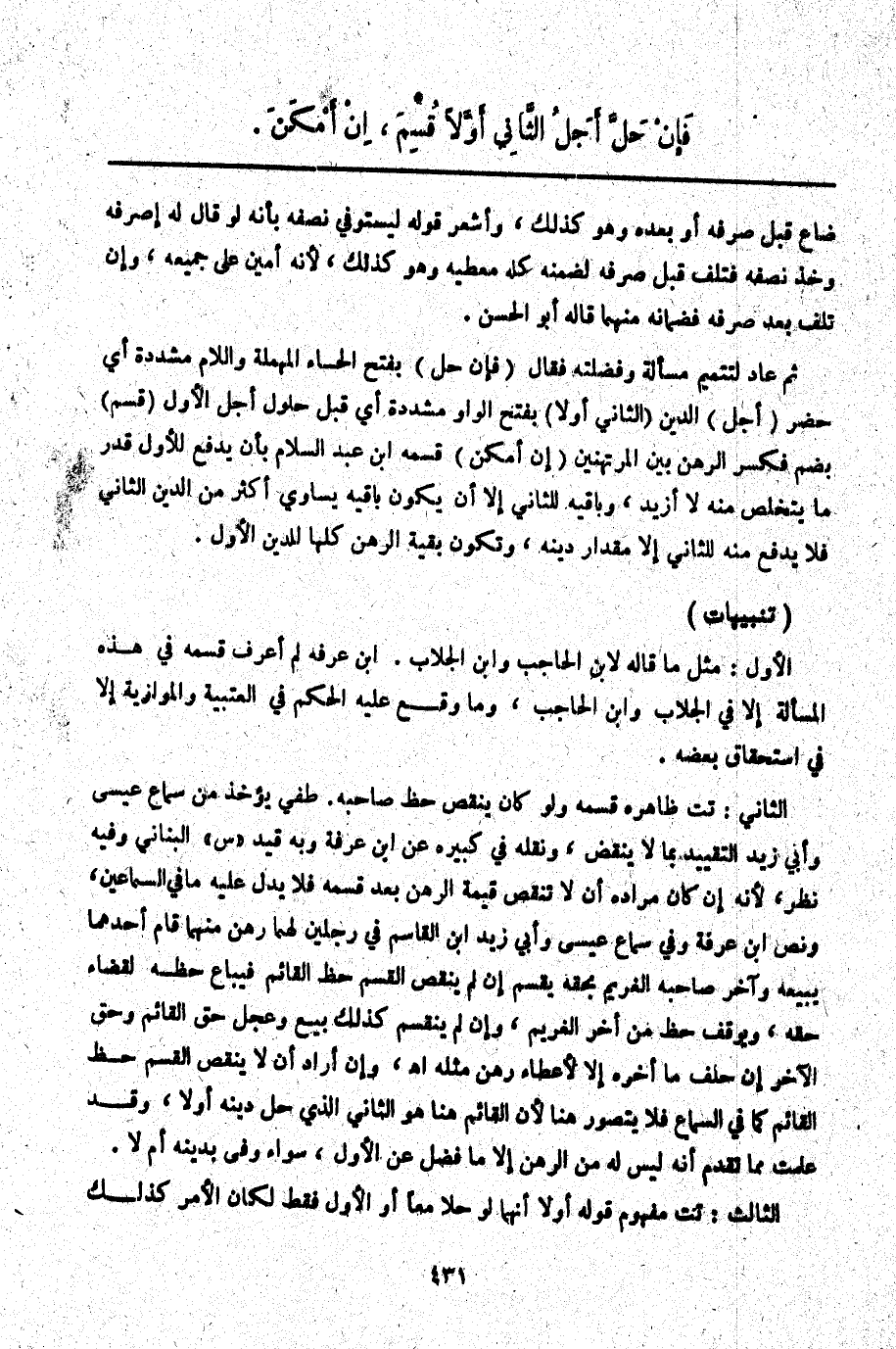 ثُمَّ عَادَ لِتَتْمِيمِ مَسْأَلَةِ وَفَضْلَتُهُ فَقَالَ (فَإِنْ حَلَّ) بِفَتْحِ الْحَاءِ الْمُهْمَلَةِ وَاللَّامِ مُشَدَّدَةً أَيْ حَضَرَ (أَجَلُ) الدَّيْنِ (الثَّانِي أَوَّلًا) بِفَتْحِ الْوَاوِ مُشَدَّدَةً أَيْ قَبْلَ حُلُولِ أَجَلِ الْأَوَّلِ (قُسِمَ) بِضَمٍّ فَكَسْرٍ الرَّهْنُ بَيْنَ الْمُرْتَهِنَيْنِ (إنْ أَمْكَنَ) قَسْمُهُ ابْنُ عَبْدِ السَّلَامِ بِأَنْ يَدْفَعَ لِلْأَوَّلِ قَدْرَ مَا يَتَخَلَّصُ مِنْهُ لَا أَزْيَدَ، وَبَاقِيهِ لِلثَّانِي إلَّا أَنْ يَكُونَ بَاقِيهِ يُسَاوِي أَكْثَرَ مِنْ الدَّيْنِ الثَّانِي فَلَا يُدْفَعُ مِنْهُ لِلثَّانِي إلَّا مِقْدَارُ دَيْنٍ، وَتَكُونُ بَقِيَّةُ الرَّهْنِ كُلُّهَا لِلدَّيْنِ الْأَوَّلِ.