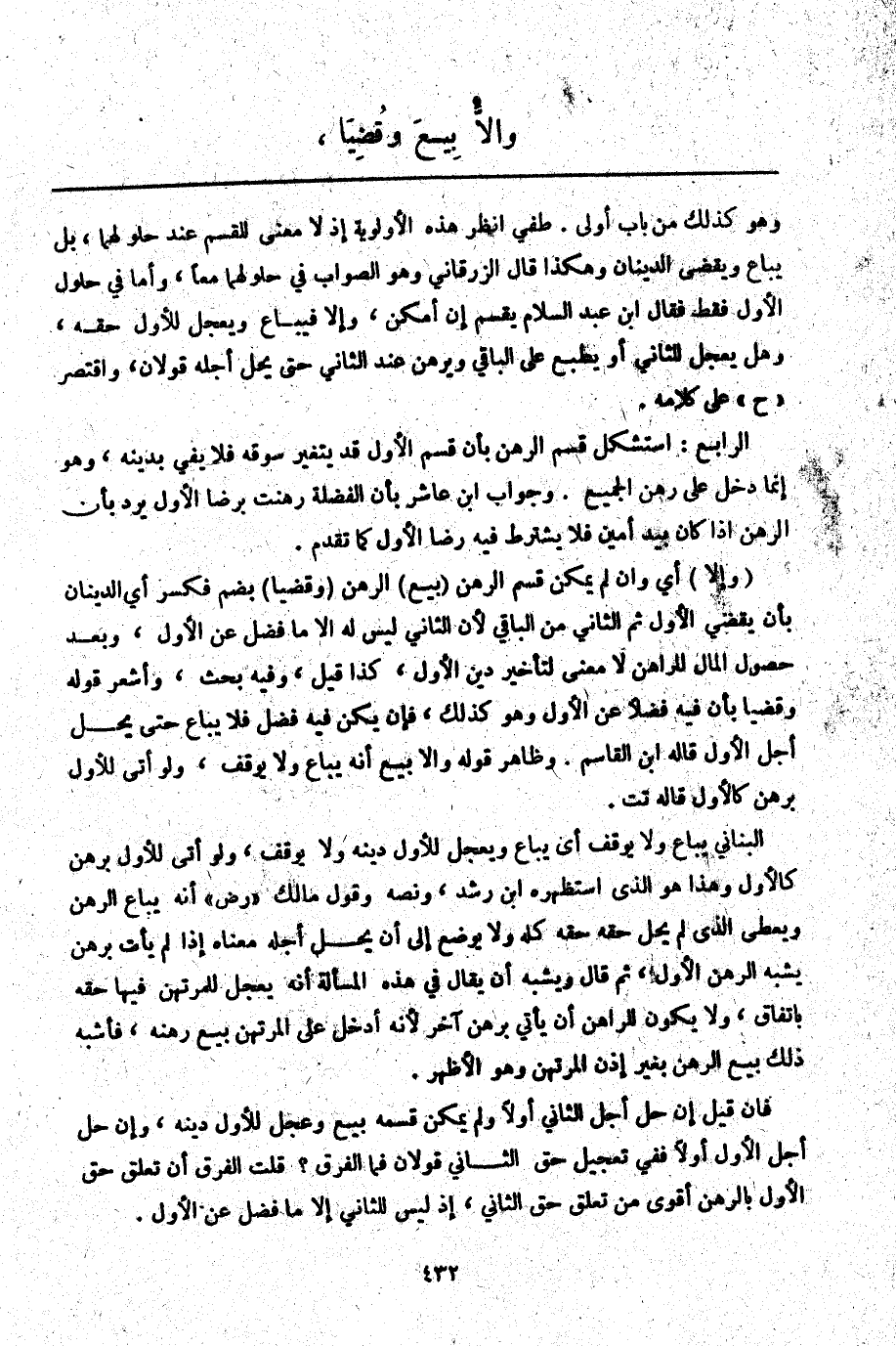 الرَّابِعُ: اسْتَشْكَلَ قَسْمَ الرَّهْنِ بِأَنَّ قَسْمَ الْأَوَّلِ قَدْ يَتَغَيَّرُ سُوقُهُ فَلَا يَفِي بِدَيْنِهِ، وَهُوَ إنَّمَا دَخَلَ عَلَى رَهْنِ الْجَمِيعِ. وَجَوَابُ ابْنِ عَاشِرٍ بِأَنَّ الْفَضْلَةَ رُهِنَتْ بِرِضَا الْأَوَّلِ يُرَدُّ بِأَنَّ الرَّهْنَ إذَا كَانَ بِيَدِ أَمِينٍ فَلَا يُشْتَرَطُ فِيهِ رِضَا الْأَوَّلِ كَمَا تَقَدَّمَ.