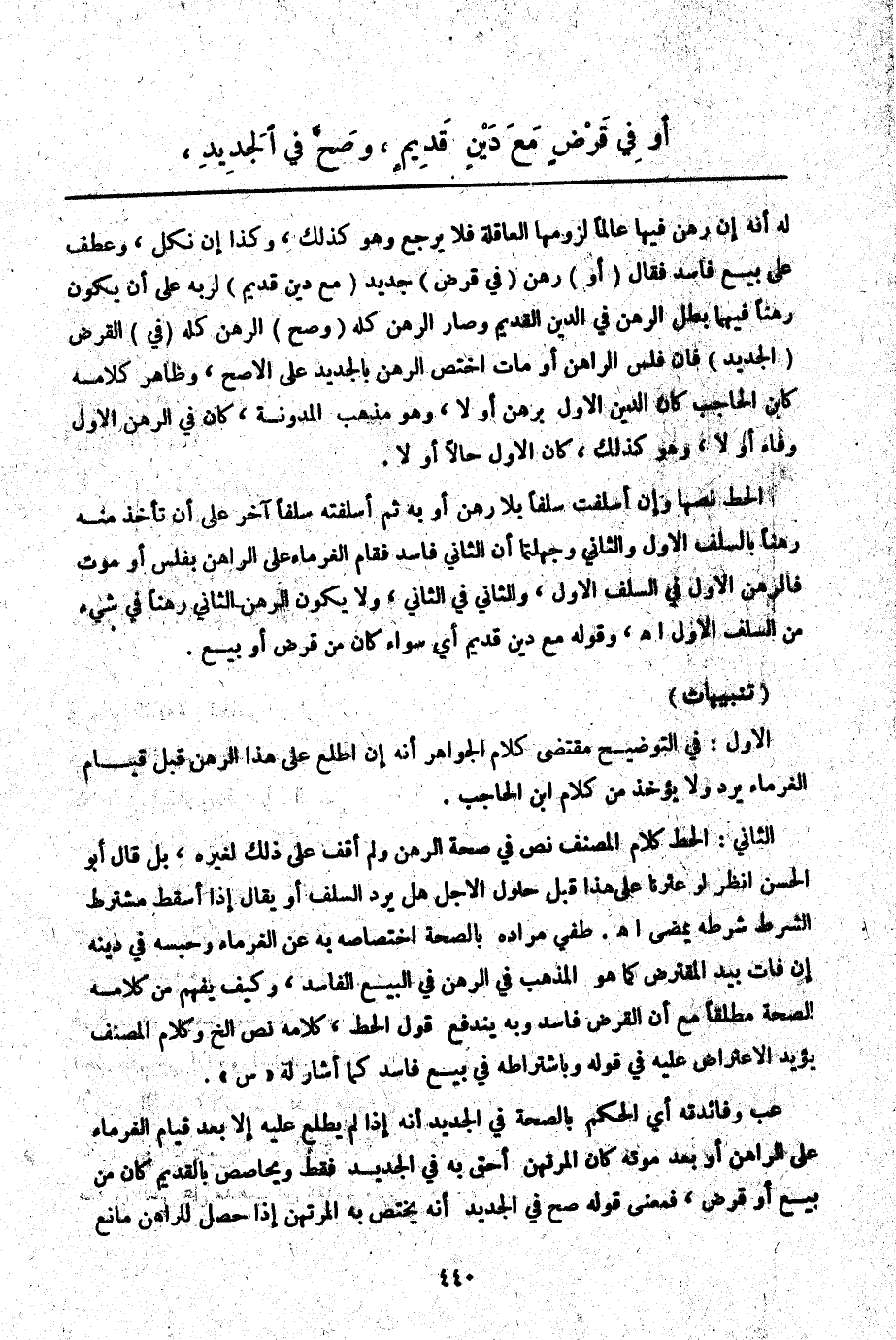 وَعَطَفَ عَلَى بَيْعٍ فَاسِدٍ فَقَالَ (أَوْ) رَهَنَ (فِي قَرْضٍ) جَدِيدٍ (مَعَ دَيْنٍ قَدِيمٍ) لِرَبِّهِ عَلَى أَنْ يَكُونَ رَهْنًا فِيهِمَا بَطَلَ الرَّهْنُ فِي الدَّيْنِ الْقَدِيمِ وَصَارَ الرَّهْنَ كُلَّهُ (وَصَحَّ) الرَّهْنُ كُلُّهُ (فِي) الْقَرْضِ (الْجَدِيدِ) فَإِنْ فَلَّسَ الرَّاهِنُ أَوْ مَاتَ اخْتَصَّ الرَّهْنُ بِالْجَدِيدِ عَلَى الْأَصَحِّ وَظَاهِرُ كَلَامِهِ كَابْنِ الْحَاجِبِ كَانَ الدَّيْنُ الْأَوَّلُ بِرَهْنٍ أَوْ لَا، وَهُوَ مَذْهَبُ الْمُدَوَّنَةِ، كَانَ فِي الرَّهْنِ الْأَوَّلِ وَفَاءٌ أَوْ لَا، وَهُوَ كَذَلِكَ، كَانَ الْأَوَّلُ حَالًّا أَوْ لَا.