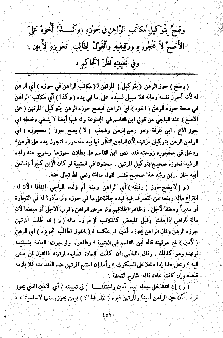 ـــــــــــــــــــــــــــــQوَصَحَّ) حَوْزُ الرَّهْنِ (بِتَوْكِيلِ) الْمُرْتَهِنِ لِ (مُكَاتَبِ الرَّاهِنِ فِي حَوْزِهِ) أَيْ الرَّهْنِ لَهُ لِأَنَّهُ أَحْرَزَ نَفْسَهُ وَمَالَهُ فَلَا سَبِيلَ لِسَيِّدِهِ عَلَى مَا فِي يَدِهِ (وَكَذَا) أَيْ مُكَاتَبُ الرَّاهِنِ فِي صِحَّةِ حَوْزِهِ الرَّهْنَ (أَخُوهُ) أَيْ الرَّاهِنِ فَيَصِحُّ حَوْزُهُ الرَّهْنَ بِتَوْكِيلِ الْمُرْتَهِنِ، (عَلَى الْأَصَحِّ) عِنْدَ الْبَاجِيَّ مِنْ قَوْلَيْ ابْنِ الْقَاسِمِ فِي الْمَجْمُوعَةِ وَلَهُ فِيهَا أَيْضًا لَا يَنْبَغِي وَضَعَّفَهُ أَيْ حَوْزَ الْأَخِ. ابْنُ عَرَفَةَ وَهُوَ رَهْنٌ لِلرَّهْنِ وَضَعْفٌ (لَا) يَصِحُّ حَوْزُ (مَحْجُورِهِ) أَيْ الرَّاهِنِ الرَّهْنَ بِتَوْكِيلِ مُرْتَهِنِهِ لِأَنَّ لِلرَّاهِنِ النَّظَرَ فِيمَا بِيَدِ مَحْجُورِهِ فَتَجُولُ يَدُهُ عَلَى الرَّهْنِ، وَدَخَلَ فِي مَحْجُورِهِ زَوْجَتُهُ فَقَدْ نَصَّ ابْنُ الْقَاسِمِ عَلَى بُطْلَانِ حَوْزِهَا وَخَرَجَ عَنْهُ وَلَدُهُ الرَّشِيدُ فَحَوْزُهُ صَحِيحٌ بِتَوْكِيلِ الْمُرْتَهِنِ. سَحْنُونٌ فِي الْعُتْبِيَّةِ لَوْ كَانَ الِابْنُ كَبِيرًا بَائِنًا عَنْ أَبِيهِ جَازَ. ابْنُ رُشْدٍ هَذَا صَحِيحٌ مُفَسِّرٌ لِقَوْلِ مَالِكٍ - رَضِيَ اللَّهُ تَعَالَى عَنْهُ -.