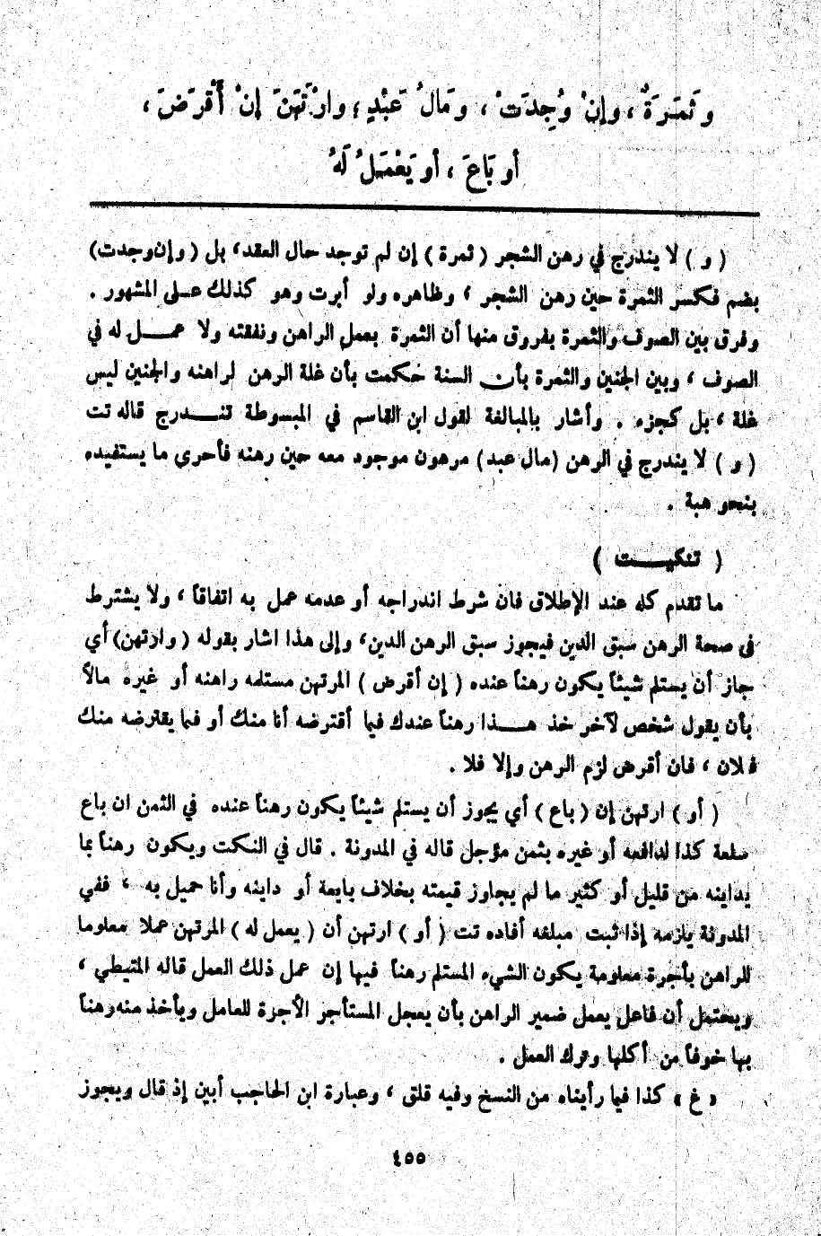 ـــــــــــــــــــــــــــــQ (وَ) لَا يَنْدَرِجُ فِي رَهْنِ الشَّجَرِ (ثَمَرَةٌ) إنْ لَمْ تُوجَدْ حَالَ الْعَقْدِ، بَلْ (وَإِنْ وُجِدَتْ) بِضَمٍّ فَكَسْرٍ الثَّمَرَةُ حِينَ رَهْنِ الشَّجَرِ، وَظَاهِرُهُ وَلَوْ أُبِّرَتْ وَهُوَ كَذَلِكَ عَلَى الْمَشْهُورِ.
