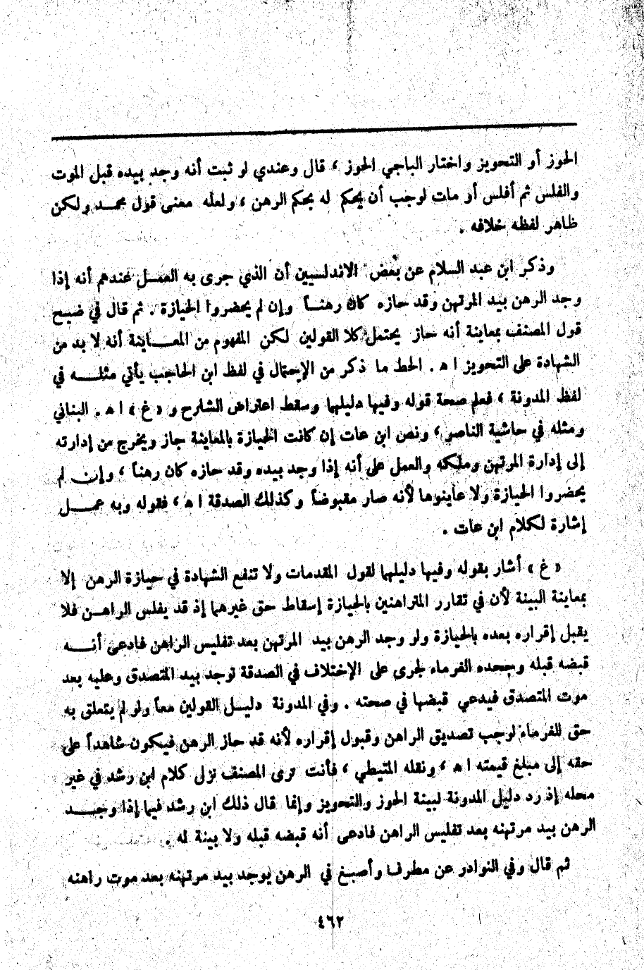 " غ " أَشَارَ بِقَوْلِهِ وَفِيهَا دَلِيلُهُمَا لِقَوْلِ الْمُقَدِّمَاتِ وَلَا تَنْفَعُ الشَّهَادَةُ فِي حِيَازَةِ الرَّهْنِ إلَّا بِمُعَايَنَةِ الْبَيِّنَةِ لِأَنَّ فِي تَقَارُرِ الْمُتَرَاهِنِينَ بِالْحِيَازَةِ إسْقَاطَ حَقِّ غَيْرِهِمَا إذْ قَدْ يُفْلِسُ الرَّاهِنُ فَلَا يُقْبَلُ إقْرَارُهُ بَعْدَهُ بِالْحِيَازَةِ وَلَوْ وُجِدَ الرَّهْنُ بِيَدِ الْمُرْتَهِنِ بَعْدَ تَفْلِيسِ الرَّاهِنِ فَادَّعَى أَنَّهُ قَبَضَهُ قَبْلَهُ وَجَحَدَهُ الْغُرَمَاءُ لَجَرَى عَلَى الِاخْتِلَافِ فِي الصَّدَقَةِ تُوجَدُ بِيَدِ الْمُتَصَدَّقِ عَلَيْهِ بَعْدَ مَوْتِ الْمُتَصَدِّقِ فَيَدَّعِي قَبْضَهَا فِي صِحَّتِهِ. وَفِي الْمُدَوَّنَةِ دَلِيلُ الْقَوْلَيْنِ مَعًا وَلَوْ لَمْ يَتَعَلَّقْ بِهِ حَقٌّ لِلْغُرَمَاءِ لَوَجَبَ تَصْدِيقُ الرَّاهِنِ وَقَبُولُ إقْرَارِهِ لِأَنَّهُ قَدْ حَازَ الرَّهْنَ فَيَكُونُ شَاهِدًا عَلَى حَقِّهِ إلَى مَبْلَغِ قِيمَتِهِ. اهـ. وَنَقَلَهُ الْمُتَيْطِيُّ، فَأَنْتَ تَرَى الْمُصَنِّفَ نَزَّلَ كَلَامَ ابْنِ رُشْدٍ فِي غَيْرِ مَحَلِّهِ إذْ رَدَّ دَلِيلَ الْمُدَوَّنَةِ لِبَيِّنَةِ الْحَوْزِ وَالتَّحْوِيزِ وَإِنَّمَا قَالَ ذَلِكَ ابْنُ رُشْدٍ فِيمَا إذَا وُجِدَ الرَّهْنُ بِيَدِ مُرْتَهِنِهِ بَعْدَ تَفْلِيسِ الرَّاهِنِ فَادَّعَى أَنَّهُ قَبَضَهُ قَبْلَهُ وَلَا بَيِّنَةَ لَهُ.