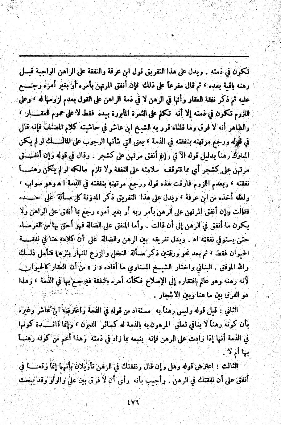 ـــــــــــــــــــــــــــــQتَكُونُ فِي ذِمَّتِهِ. وَيَدُلُّ عَلَى هَذَا التَّفْرِيقِ قَوْلُ ابْنِ عَرَفَةَ وَالنَّفَقَةُ عَلَى الرَّاهِنِ الْوَاجِبَةُ قَبْلَ رَهْنِهِ بَاقِيَةٌ بَعْدَهُ، ثُمَّ قَالَ مُفَرِّعًا عَلَى ذَلِكَ فَإِنْ أَنْفَقَ الْمُرْتَهِنُ بِأَمْرِهِ أَوْ بِغَيْرِ أَمْرِهِ رَجَعَ عَلَيْهِ ثُمَّ ذَكَرَ نَفَقَةَ الْعَقَارِ وَأَنَّهَا فِي الرَّهْنِ لَا فِي ذِمَّةِ الرَّاهِنِ عَلَى الْقَوْلِ بِعَدَمِ لُزُومِهَا لَهُ، وَعَلَى اللُّزُومِ تَكُونُ فِي ذِمَّتِهِ إلَّا أَنَّهُ تَكَلَّمَ عَلَى الثَّمَرَةِ الْمَأْبُورَةِ بِيَدِهِ فَقَطْ لَا عَلَى عُمُومِ الْعَقَارِ وَالظَّاهِرُ أَنَّهُ لَا فَرْقَ وَمَا قُلْنَاهُ قَرَّرَ بِهِ الشَّيْخُ ابْنُ عَاشِرٍ فِي حَاشِيَتِهِ كَلَامُ الْمُصَنِّفِ فَإِنَّهُ قَالَ فِي قَوْلِهِ وَرَجَعَ مُرْتَهِنُهُ بِنَفَقَتِهِ فِي الذِّمَّةِ، يَعْنِي الَّتِي شَأْنُهَا الْوُجُوبُ عَلَى الْمَالِكِ لَوْ لَمْ يَكُنْ الْمَمْلُوكُ رَهْنًا بِدَلِيلِ قَوْلِهِ الْآتِي وَإِنْ أَنْفَقَ مُرْتَهِنٌ عَلَى كَشَجَرٍ. وَقَالَ فِي قَوْلِهِ وَإِنْ أَنْفَقَ مُرْتَهِنٌ عَلَى كَشَجَرٍ أَيْ مِمَّا تُوقَفُ سَلَامَتُهُ عَلَى النَّفَقَةِ وَلَا تَلْزَمُ مَالِكَهُ لَوْ لَمْ يَكُنْ رَهْنًا نَفَقَتُهُ، وَبِعَدَمِ اللُّزُومِ فَارَقَتْ هَذِهِ قَوْلَهُ وَرَجَعَ مُرْتَهِنُهُ بِنَفَقَتِهِ فِي الذِّمَّةِ اهـ وَهُوَ صَوَابٌ، وَلَعَلَّهُ أَخَذَهُ مِنْ ابْنِ عَرَفَةَ، وَيَدُلُّ عَلَى هَذَا التَّفْرِيقِ ذِكْرُ الْمُدَوَّنَةِ كُلَّ مَسْأَلَةٍ عَلَى حِدَةٍ فَقَالَتْ وَإِنْ أَنْفَقَ الْمُرْتَهِنُ عَلَى الرَّهْنِ بِأَمْرِ رَبِّهِ أَوْ بِغَيْرِ أَمْرِهِ رَجَعَ بِمَا أَنْفَقَ عَلَى الرَّاهِنِ وَلَا يَكُونُ مِمَّا أَنْفَقَ فِي الرَّهْنِ إلَى أَنْ قَالَتْ. وَأَمَّا الْمُنْفِقُ عَلَى الضَّالَّةِ فَهُوَ أَحَقُّ بِهَا مِنْ الْغُرَمَاءِ حَتَّى يَسْتَوْفِيَ نَفَقَتَهُ اهـ. وَيَدُلُّ تَفْرِيقُهُ بَيْنَ الرَّهْنِ وَالضَّالَّةِ عَلَى أَنَّ كَلَامَهُ هُنَا فِي نَفَقَةِ الْحَيَوَانِ فَقَطْ، ثُمَّ بَعْدَ نَحْوِ وَرَقَتَيْنِ ذَكَرَ مَسْأَلَةَ النَّخْلِ وَالزَّرْعِ الْمُنْهَارِ بِئْرُهُمَا فَتَأَمَّلْ ذَلِكَ وَاَللَّهُ الْمُوَفِّقُ. الْبُنَانِيُّ وَاخْتَارَ الشَّيْخُ الْمِسْنَاوِيُّ مَا أَفَادَهُ " ز " مِنْ أَنَّ الْعَقَارَ كَالْحَيَوَانِ لِأَنَّهُ رَهَنَهُ وَهُوَ عَالِمٌ بِافْتِقَارِهِ إلَى الْإِصْلَاحِ فَكَأَنَّهُ أَمَرَهُ بِالنَّفَقَةِ فَيَرْجِعُ بِهَا فِي الذِّمَّةِ، وَهَذَا هُوَ الْفَرْقُ بَيْنَ مَا هُنَا وَبَيْنَ الْأَشْجَارِ.