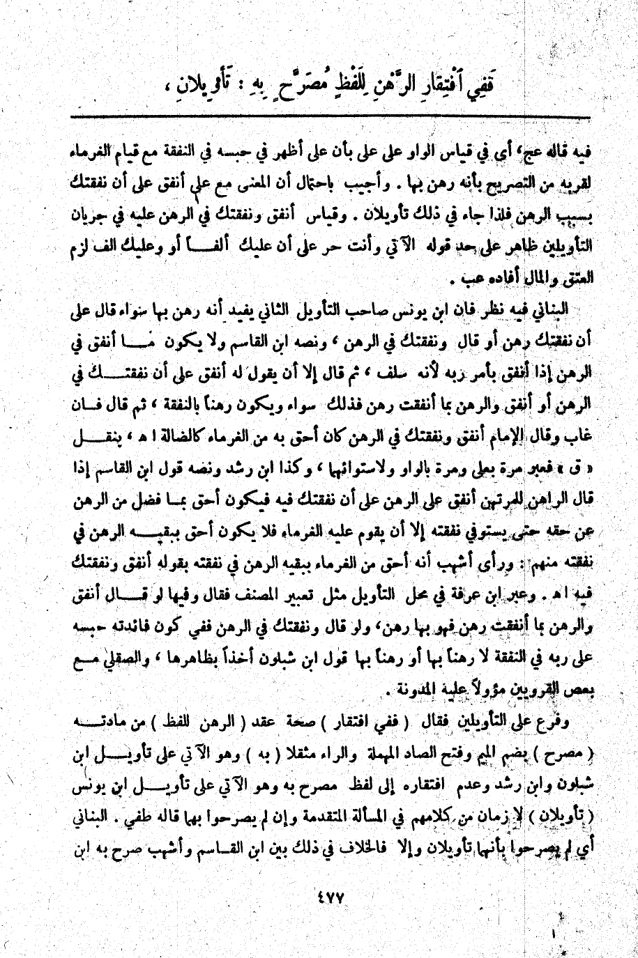 وَفَرَّعَ عَلَى التَّأْوِيلَيْنِ فَقَالَ (فَفِي افْتِقَارِ) صِحَّةِ عَقْدِ (الرَّهْنِ لِلَّفْظِ) مِنْ مَادَّتِهِ (مُصَرَّحٍ) بِضَمِّ الْمِيمِ وَفَتْحِ الصَّادِ الْمُهْمَلَةِ وَالرَّاءِ مُثَقَّلًا (بِهِ) وَهُوَ الْآتِي عَلَى تَأْوِيلِ ابْنِ شَبْلُونٍ وَابْنِ رُشْدٍ وَعَدَمُ افْتِقَارِهِ إلَى لَفْظٍ مُصَرَّحٍ بِهِ وَهُوَ الْآتِي عَلَى تَأْوِيلِ ابْنِ يُونُسَ (تَأْوِيلَانِ) لَازِمَانِ مِنْ كَلَامِهِمْ فِي الْمَسْأَلَةِ الْمُتَقَدِّمَةِ وَإِنْ لَمْ يُصَرِّحُوا بِهِمَا قَالَهُ طفي. الْبُنَانِيُّ أَيْ لَمْ يُصَرِّحُوا بِأَنَّهُمَا تَأْوِيلَانِ وَإِلَّا فَالْخِلَافُ فِي ذَلِكَ بَيْنَ ابْنِ الْقَاسِمِ وَأَشْهَبَ صَرَّحَ بِهِ ابْنُ رُشْدٍ