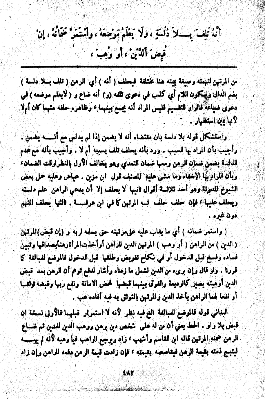 ـــــــــــــــــــــــــــــQمِنْ الْمُرْتَهِنِ لِتُهْمَتِهِ وَصِيغَةُ يَمِينِهِ هُنَا مُخْتَلِفَةٌ فَيَحْلِفُ (أَنَّهُ) أَيْ الرَّهْنَ (تَلِفَ بِلَا دُلْسَةٍ) بِضَمِّ الدَّالِ وَسُكُونِ اللَّامِ أَيْ كَذِبٍ فِي دَعْوَى تَلَفِهِ (و) أَنَّهُ ضَاعَ و (لَا يَعْلَمُ مَوْضِعَهُ) فِي دَعْوَى ضَيَاعِهِ فَالْوَاو لِلتَّقْسِيمِ فَلَيْسَ الْمُرَادُ أَنَّهُ يُجْمَعُ بَيْنَهُمَا، وَظَاهِرُهُ حَلَفَ مُتَّهَمًا كَانَ أَمْ لَا لِأَنَّهَا يَمِينُ اسْتِظْهَارٍ.