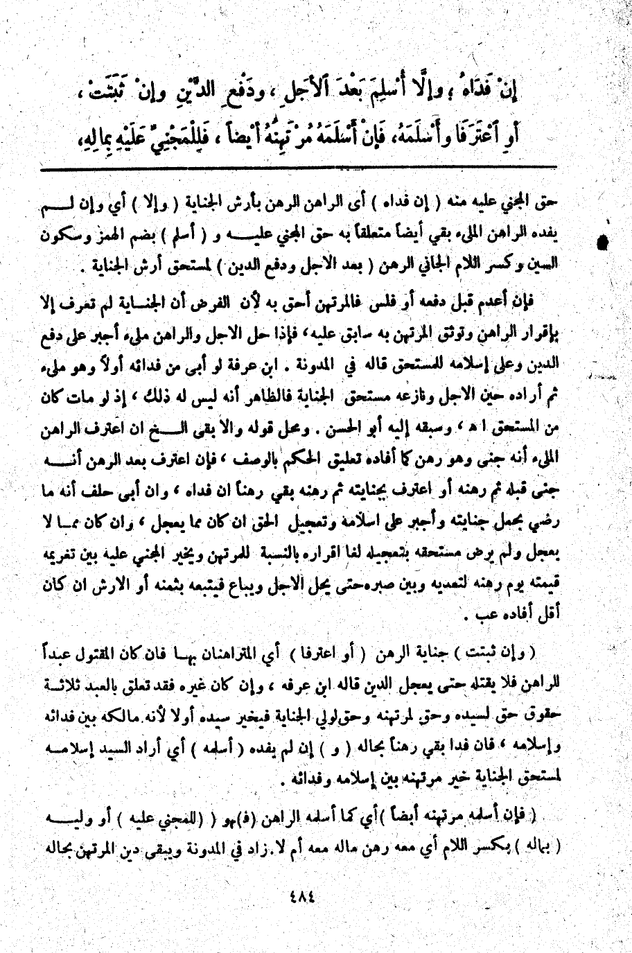 ـــــــــــــــــــــــــــــQحَقُّ الْمَجْنِيِّ عَلَيْهِ مِنْهُ (إنْ فَدَاهُ) أَيْ الرَّاهِنُ الرَّهْنَ بِأَرْشِ الْجِنَايَةِ (وَإِلَّا) أَيْ وَإِنْ لَمْ يَفْدِهِ الرَّاهِنُ الْمَلِيءُ بَقِيَ أَيْضًا مُتَعَلِّقًا بِهِ حَقُّ الْمَجْنِيِّ عَلَيْهِ و (أَسْلَمَ) بِضَمِّ الْهَمْزِ وَسُكُونِ السِّينِ وَكَسْرِ اللَّامِ الْجَانِي الرَّهْنَ (بَعْدَ الْأَجَلِ وَدَفَعَ الدَّيْنَ) لِمُسْتَحِقِّ أَرْشِ الْجِنَايَةِ.
