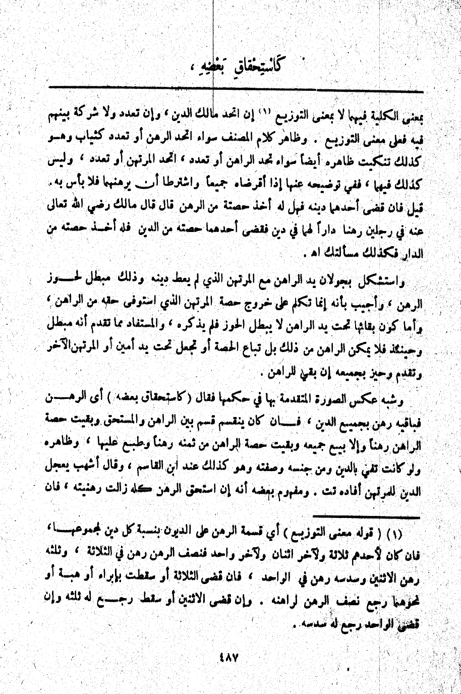 ـــــــــــــــــــــــــــــQبِمَعْنَى الْكُلِّيَّةِ فِيهِمَا لَا بِمَعْنَى التَّوْزِيعِ إنْ اتَّحَدَ مَالِكُ الدَّيْنِ، وَإِنْ تَعَدَّدَ وَلَا شَرِكَةَ بَيْنَهُمْ فِيهِ فَعَلَى مَعْنَى التَّوْزِيعِ. وَظَاهِرُ كَلَامِ الْمُصَنِّفِ سَوَاءٌ اتَّحَدَ الرَّهْنُ أَوْ تَعَدَّدَ كَثِيَابٍ وَهُوَ كَذَلِكَ تَنْكِيتٌ ظَاهِرُهُ أَيْضًا سَوَاءٌ اتَّحَدَ الرَّاهِنُ أَوْ تَعَدَّدَ، اتَّحَدَ الْمُرْتَهِنُ أَوْ تَعَدَّدَ، وَلَيْسَ كَذَلِكَ فِيهِمَا، فَفِي تَوْضِيحِهِ عَنْهَا إذَا أَقْرَضَاهُ جَمِيعًا وَاشْتَرَطَا أَنْ يَرْهَنَهُمَا فَلَا بَأْسَ بِهِ. قِيلَ فَإِنْ قَضَى أَحَدُهُمَا دَيْنَهُ فَهَلْ لَهُ أَخْذُ حِصَّتِهِ مِنْ الرَّهْنِ قَالَ قَالَ مَالِكٌ - رَضِيَ اللَّهُ تَعَالَى عَنْهُ - فِي رَجُلَيْنِ رَهَنَا دَارًا لَهُمَا فِي دَيْنٍ فَقَضَى أَحَدُهُمَا حِصَّتَهُ مِنْ الدَّيْنِ فَلَهُ أَخْذُ حِصَّتِهِ مِنْ الدَّارِ فَكَذَلِكَ مَسْأَلَتُك اهـ.