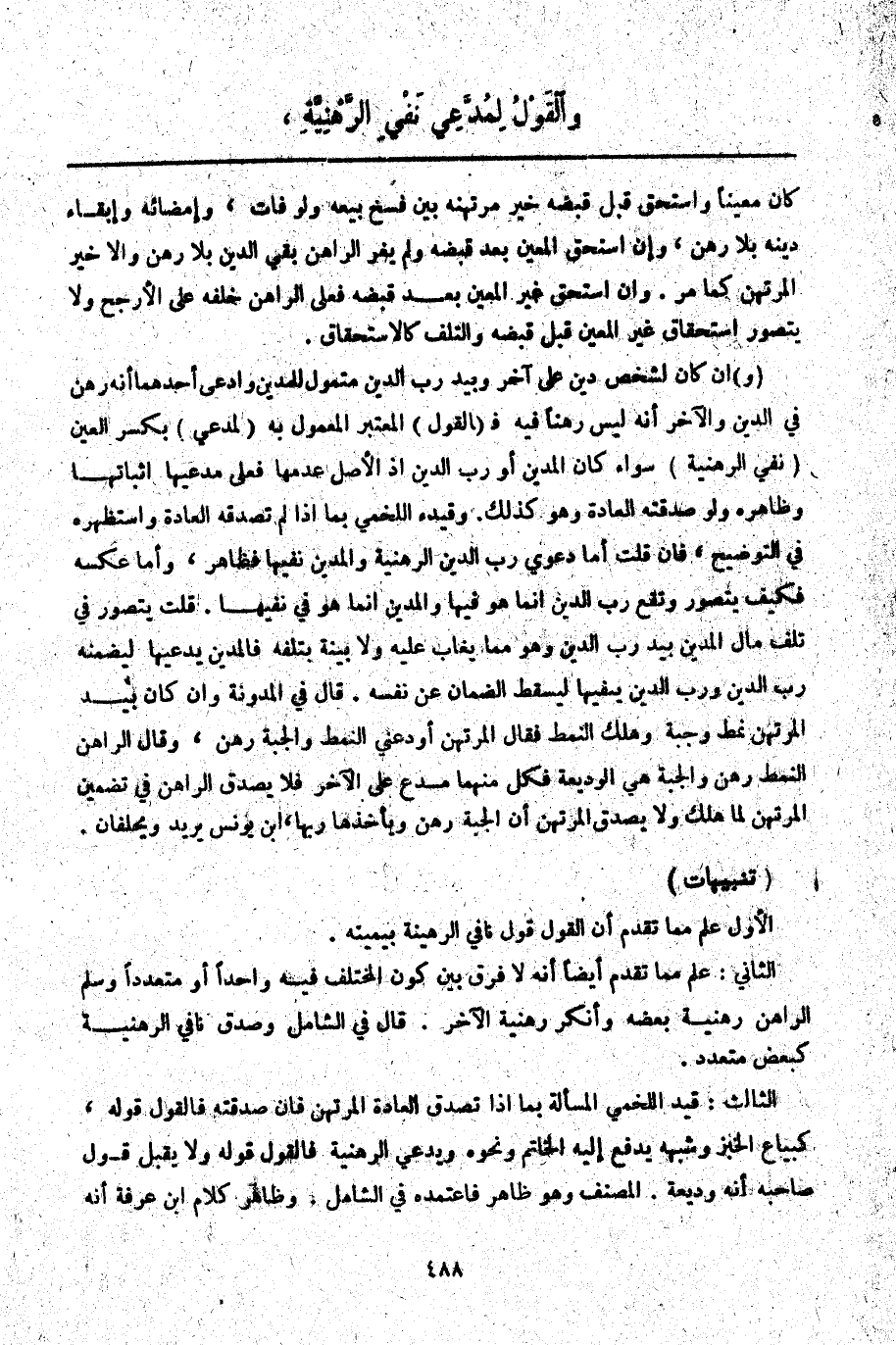 الثَّانِي: عُلِمَ مِمَّا تَقَدَّمَ أَيْضًا أَنَّهُ لَا فَرْقَ بَيْنَ كَوْنِ الْمُتَخَلِّفِ فِيهِ وَاحِدًا أَوْ مُتَعَدِّدًا وَسَلَّمَ الرَّاهِنُ رَهِينَةَ بَعْضِهِ وَأَنْكَرَ رَهِينَةَ الْآخَرِ. قَالَ فِي الشَّامِلِ وَصُدِّقَ نَافِي الرَّهْنِيَّةِ كَبَعْضٍ مُتَعَدِّدٍ.