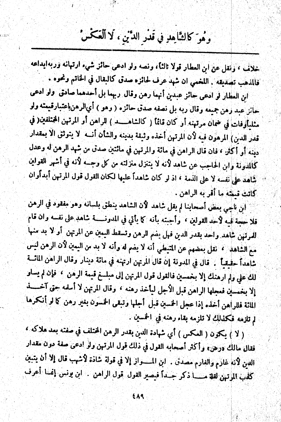 ابْنُ الْعَطَّارِ لَوْ ادَّعَى حَائِزُ عَبْدَيْنِ أَنَّهُمَا رَهْنٌ وَقَالَ رَبُّهُمَا بَلْ أَحَدُهُمَا صَادِقٌ وَلَوْ ادَّعَى حَائِزُ عَبْدٍ رُهِنَ جَمِيعُهُ وَقَالَ رَبُّهُ بَلْ نِصْفُهُ صُدِّقَ حَائِزُهُ (وَهُوَ) أَيْ الرَّهْنُ بِاعْتِبَارِهِ قِيمَتَهُ وَلَوْ مِثْلِيًّا وَفَاتَ فِي ضَمَانِ مُرْتَهِنِهِ أَوْ كَانَ قَائِمًا (كَالشَّاهِدِ) لِلرَّاهِنِ أَوْ الْمُرْتَهِنِ الْمُخْتَلِفَيْنِ (فِي قَدْرِ الدَّيْنِ) الْمَرْهُونِ فِيهِ لِأَنَّ الْمُرْتَهِنَ أَخَذَهُ وَثِيقَةً بِدَيْنِهِ وَالشَّأْنُ أَنَّهُ لَا يَتَوَثَّقُ إلَّا بِمِقْدَارِ دِينِهِ أَوْ أَكْثَرَ، فَإِنْ قَالَ الرَّاهِنُ فِي مِائَةٍ وَالْمُرْتَهِنُ فِي مِائَتَيْنِ صُدِّقَ مَنْ شَهِدَ الرَّهْنُ لَهُ وَعَدْلٌ كَالْمُدَوَّنَةِ وَابْنِ الْحَاجِبِ عَنْ شَاهِدٍ لِأَنَّهُ لَا يَتَنَزَّلُ مَنْزِلَتَهُ مِنْ كُلِّ وَجْهٍ لِأَنَّهُ فِي أَشْهُرِ الْقَوْلَيْنِ شَاهِدٌ عَلَى نَفْسِهِ لَا عَلَى الذِّمَّةِ، إذْ لَوْ كَانَ شَاهِدًا عَلَيْهَا لَكَانَ الْقَوْلُ قَوْلَ الْمُرْتَهِنِ أَبَدًا وَإِنْ كَانَتْ قِيمَتُهُ مَا أَقَرَّ بِهِ الرَّاهِنُ.