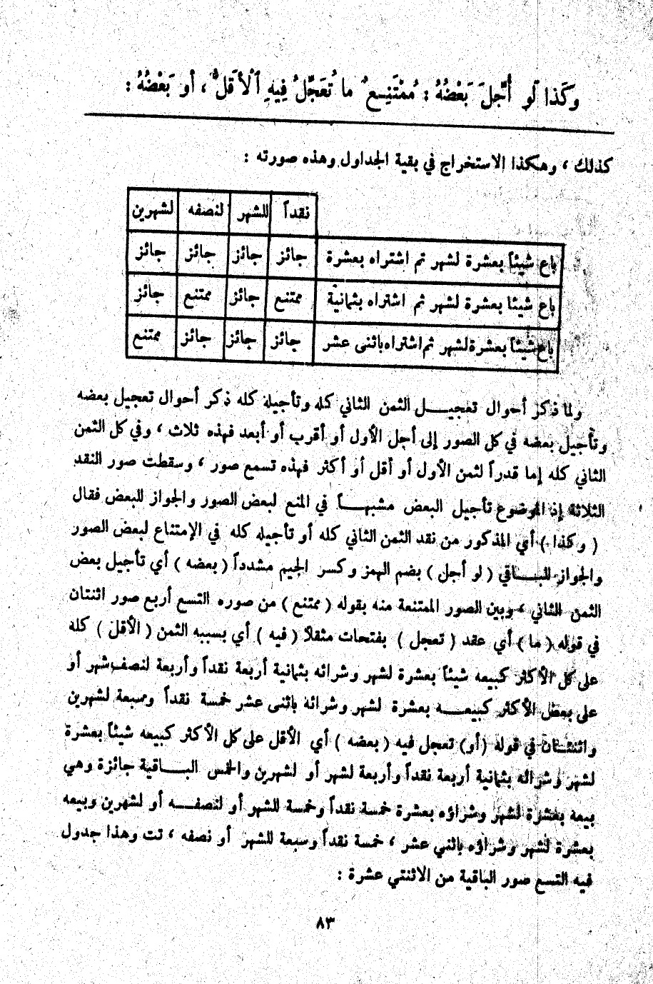ـــــــــــــــــــــــــــــQكَذَلِكَ، وَهَكَذَا الِاسْتِخْرَاجُ فِي بَقِيَّةِ الْجَدَاوِلِ وَهَذِهِ صُورَتُهُ: | نَقْدًا | لِلشَّهْرِ | لِنِصْفِهِ | لِشَهْرَيْنِ | | | | بَاعَ شَيْئًا بِعَشَرَةٍ لِشَهْرٍ ثُمَّ اشْتَرَاهُ بِعَشَرَةٍ | جَائِزٌ | جَائِزٌ | جَائِزٌ | جَائِزٌ | | | | | بَاعَ شَيْئًا بِعَشَرَةٍ لِشَهْرٍ ثُمَّ اشْتَرَاهُ بِثَمَانِيَةٍ | مُمْتَنِعٌ | جَائِزٌ | مُمْتَنِعٌ | جَائِزٌ | | | | | بَاعَ شَيْئًا بِعَشَرَةٍ لِشَهْرٍ ثُمَّ اشْتَرَاهُ بِاثْنَيْ عَشَرَ | جَائِزٌ | جَائِزٌ | جَائِزٌ | مُمْتَنِعٌ | | | |.