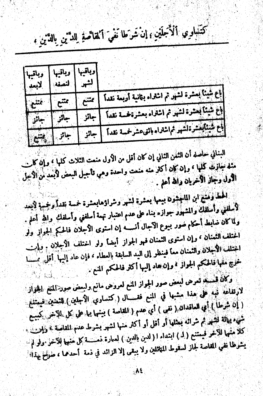 ـــــــــــــــــــــــــــــQوَبَاقِيَهَا | وَبَاقِيَهَا | وَبَاقِيَهَا | | لِشَهْرٍ | لِنِصْفِهِ | لِأَبْعَدَ | | | | بَاعَ شَيْئًا بِعَشَرَةٍ لِشَهْرٍ ثُمَّ اشْتَرَاهُ بِثَمَانِيَةٍ أَرْبَعَةٍ نَقْدًا | مُمْتَنِعٌ | مُمْتَنِعٌ | مُمْتَنِعٌ | | | | | بَاعَ شَيْئًا بِعَشَرَةٍ لِشَهْرٍ ثُمَّ اشْتَرَاهُ بِعَشَرَةٍ خَمْسَةٍ نَقْدًا | جَائِزٌ | جَائِزٌ | جَائِزٌ | | | | | بَاعَ شَيْئًا بِعَشَرَةٍ لِشَهْرٍ ثُمَّ اشْتَرَاهُ بِاثْنَيْ عَشَرَ خَمْسَةٍ نَقْدًا | جَائِزٌ | جَائِزٌ | جَائِزٌ | | | | الْبُنَانِيُّ حَاصِلُهُ أَنَّ الثَّمَنَ الثَّانِيَ إنْ كَانَ أَقَلَّ مِنْ الْأَوَّلِ مُنِعَتْ الثَّلَاثُ كُلُّهَا، وَإِنْ كَانَ مِثْلَهُ جَازَتْ كُلُّهَا، وَإِنْ كَانَ أَكْثَرَ مِنْهُ مُنِعَتْ وَاحِدَةٌ وَهِيَ تَأْجِيلُ الْبَعْضِ لِأَبْعَدَ مِنْ الْأَجَلِ الْأَوَّلِ وَجَازَ الْأُخْرَيَانِ وَاَللَّهُ أَعْلَمُ. الْحَطّ وَمَنَعَ ابْنُ الْمَاجِشُونِ بَيْعَهَا بِعَشَرَةٍ لِشَهْرٍ وَشِرَاؤُهَا بِعَشَرَةٍ خَمْسَةً نَقْدًا وَخَمْسَةً لِأَبْعَدَ لِأَسْلِفْنِي وَأُسْلِفُك وَالْمَشْهُورُ جَوَازُهُ بِنَاءً عَلَى عَدَمِ اعْتِبَارِ تُهْمَةِ وَأَسْلِفْنِي وَأُسْلِفُك وَاَللَّهُ أَعْلَمُ.