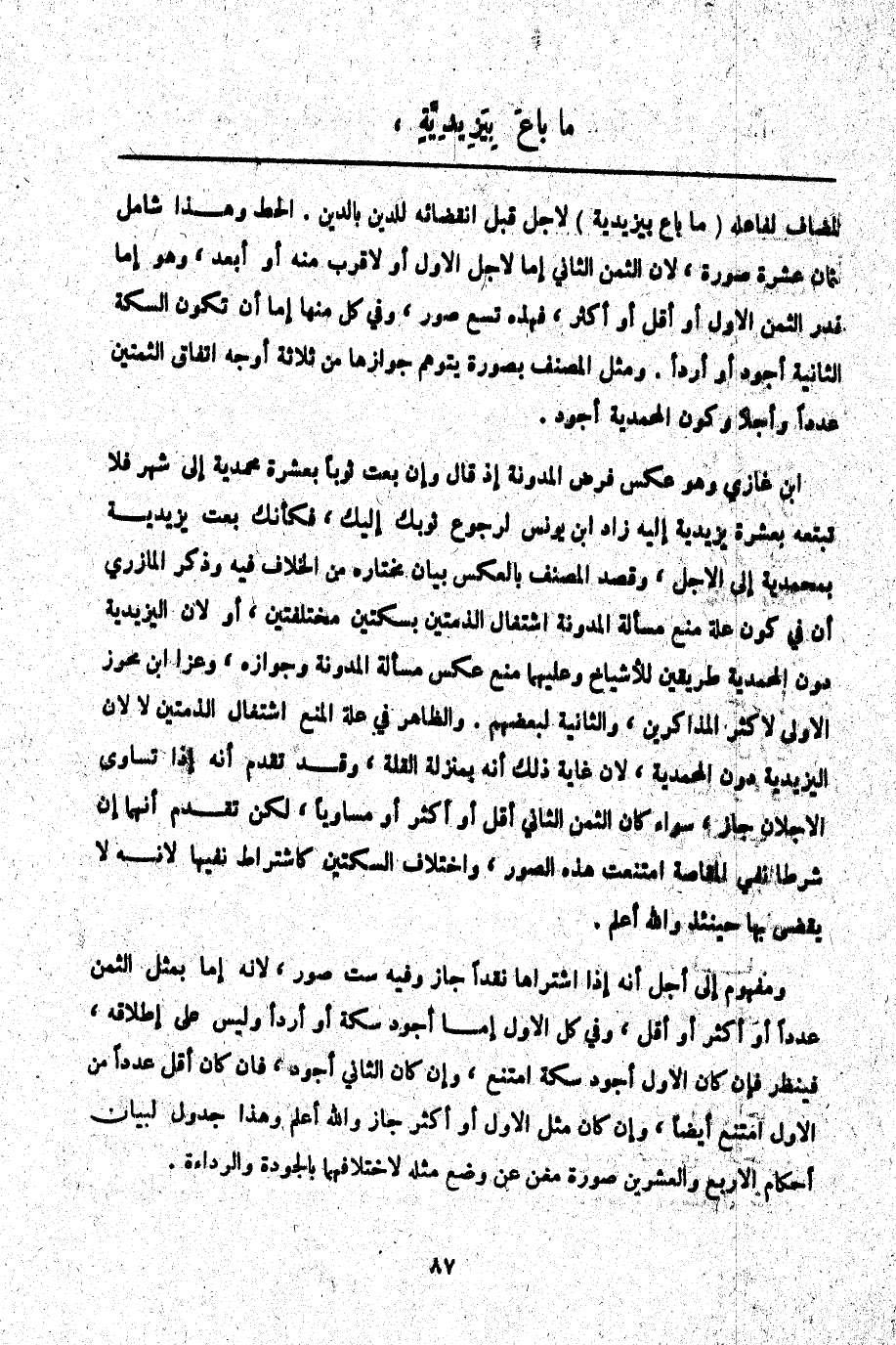 ـــــــــــــــــــــــــــــQالْمُضَافِ لِفَاعِلِهِ (مَا بَاعَ بِيَزِيدِيَّةٍ) لِأَجَلٍ قَبْلَ انْقِضَائِهِ لِلدَّيْنِ بِالدَّيْنِ. الْحَطّ وَهَذَا شَامِلٌ لِثَمَانِ عَشْرَةَ صُورَةً لِأَنَّ الثَّمَنَ الثَّانِيَ إمَّا لِأَجَلِ الْأَوَّلِ أَوْ لِأَقْرَبَ مِنْهُ أَوْ أَبْعَدَ، وَهُوَ إمَّا قَدْرُ الثَّمَنِ الْأَوَّلِ أَوْ أَقَلُّ أَوْ أَكْثَرُ، فَهَذِهِ تِسْعُ صُوَرٍ، وَفِي كُلٍّ مِنْهَا إمَّا أَنْ تَكُونَ السِّكَّةُ الثَّانِيَةُ أَجْوَدَ أَوْ أَرْدَأَ.