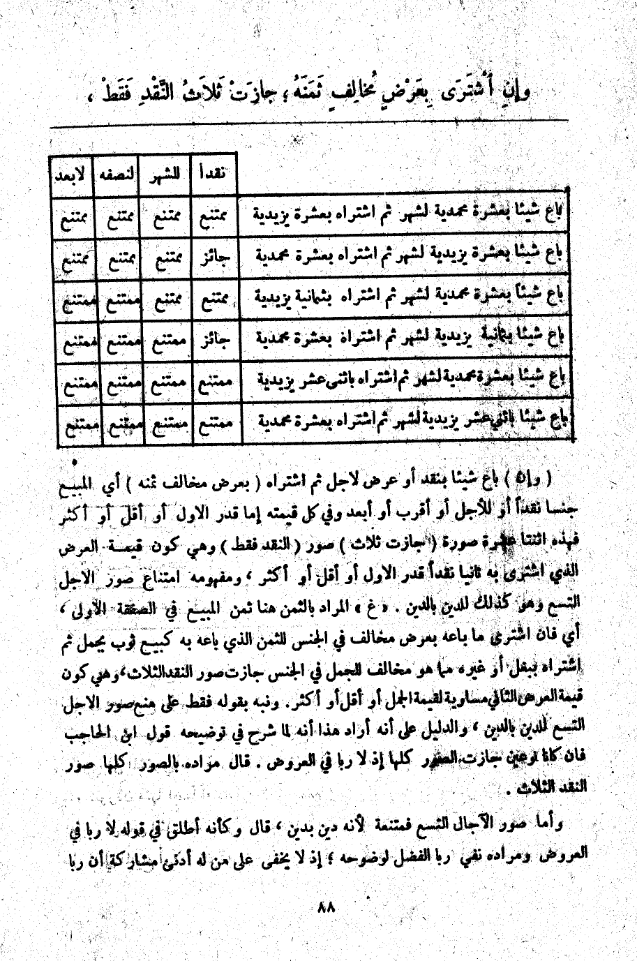ـــــــــــــــــــــــــــــQنَقْدًا | لِلشَّهْرِ | لِنِصْفِهِ | لِأَبْعَدَ | | | | بَاعَ شَيْئًا بِعَشَرَةٍ مُحَمَّدِيَّةٍ لِشَهْرٍ ثُمَّ اشْتَرَاهُ بِعَشَرَةٍ يَزِيدِيَّةٍ | مُمْتَنِعٌ | مُمْتَنِعٌ | مُمْتَنِعٌ | مُمْتَنِعٌ | | | | | بَاعَ شَيْئًا بِعَشَرَةٍ يَزِيدِيَّةٍ لِشَهْرٍ ثُمَّ اشْتَرَاهُ بِعَشَرَةٍ مُحَمَّدِيَّةٍ | جَائِزٌ | مُمْتَنِعٌ | مُمْتَنِعٌ | مُمْتَنِعٌ | | | | | بَاعَ شَيْئًا بِعَشَرَةٍ مُحَمَّدِيَّةٍ لِشَهْرٍ ثُمَّ اشْتَرَاهُ بِثَمَانِيَةٍ يَزِيدِيَّةٍ | مُمْتَنِعٌ | مُمْتَنِعٌ | مُمْتَنِعٌ | مُمْتَنِعٌ | | | | | بَاعَ شَيْئًا بِثَمَانِيَةٍ يَزِيدِيَّةٍ لِشَهْرٍ ثُمَّ اشْتَرَاهُ بِعَشَرَةٍ مُحَمَّدِيَّةٍ | جَائِزٌ | مُمْتَنِعٌ | مُمْتَنِعٌ | مُمْتَنِعٌ | | | | | بَاعَ شَيْئًا بِعَشَرَةٍ مُحَمَّدِيَّةٍ لِشَهْرٍ ثُمَّ اشْتَرَاهُ بِاثْنَيْ عَشَرَ يَزِيدِيَّةٍ | مُمْتَنِعٌ | مُمْتَنِعٌ | مُمْتَنِعٌ | مُمْتَنِعٌ | | | | | بَاعَ شَيْئًا بِاثْنَيْ عَشَرَ يَزِيدِيَّةٍ لِشَهْرٍ ثُمَّ اشْتَرَاهُ بِعَشَرَةٍ مُحَمَّدِيَّةٍ | مُمْتَنِعٌ | مُمْتَنِعٌ | مُمْتَنِعٌ | مُمْتَنِعٌ | | | |.