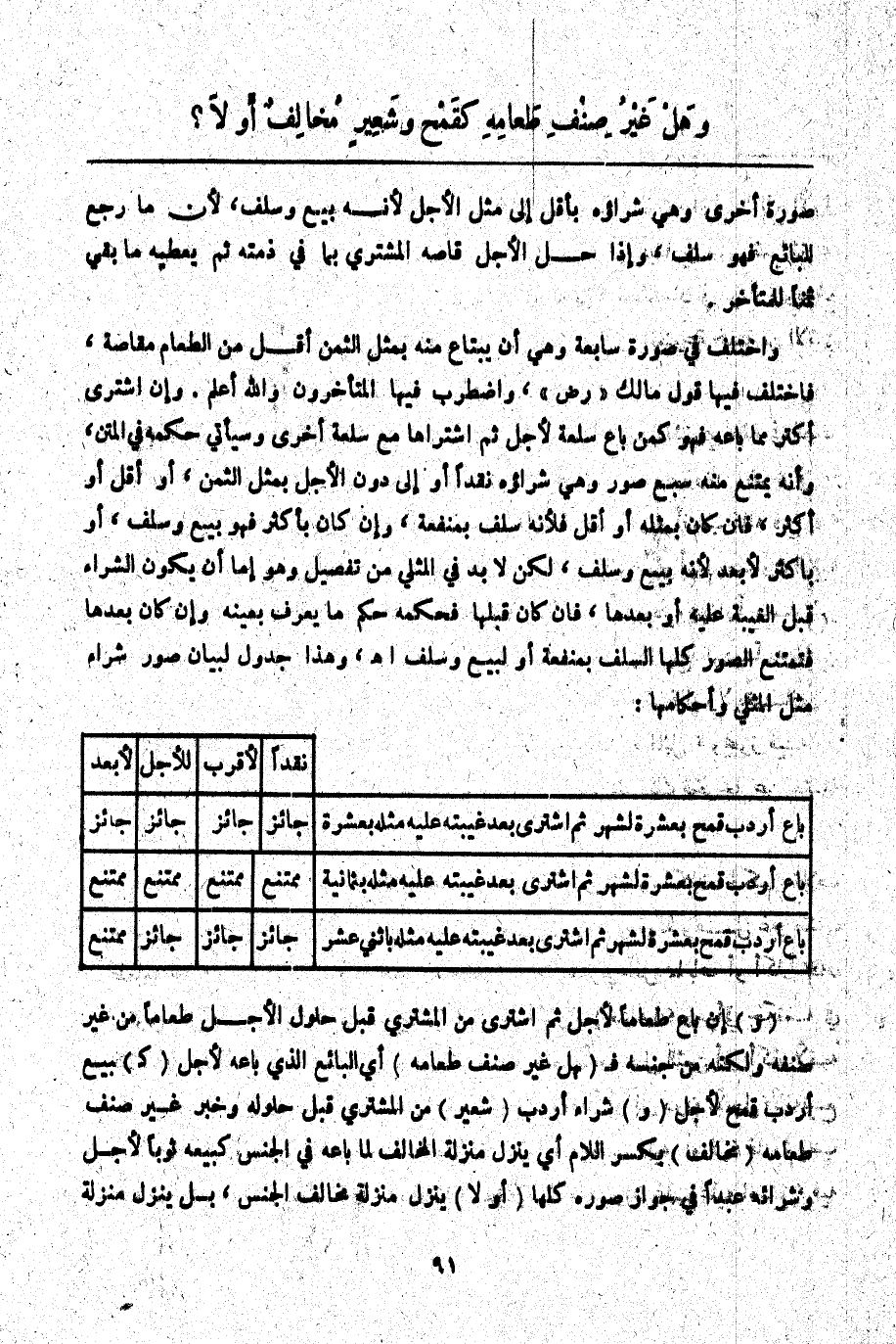 (وَ) إنْ بَاعَ طَعَامًا لِأَجَلٍ ثُمَّ اشْتَرَى مِنْ الْمُشْتَرِي قَبْلَ حُلُولِ الْأَجَلِ طَعَامًا مِنْ غَيْرِ صِنْفِهِ وَلَكِنَّهُ مِنْ جِنْسِهِ فَ (هَلْ غَيْرُ صِنْفِ طَعَامِهِ) أَيْ الْبَائِعِ الَّذِي بَاعَهُ لِأَجَلٍ (كَ) بَيْعِ إرْدَبِّ قَمْحٍ لِأَجَلٍ (وَ) شِرَاءِ إرْدَبِّ (شَعِيرٍ) مِنْ الْمُشْتَرِي قَبْلَ حُلُولِهِ وَخَبَرُ غَيْرُ صِنْفِ طَعَامِهِ (مُخَالِفٌ) بِكَسْرِ اللَّامِ أَيْ يُنَزَّلُ مَنْزِلَةَ الْمُخَالِفِ لِمَا بَاعَهُ فِي الْجِنْسِ كَبَيْعِهِ ثَوْبًا لِأَجَلٍ وَشِرَائِهِ عَبْدًا فِي جَوَازِ صُوَرِهِ كُلِّهَا (أَوْ لَا) يُنَزَّلُ مَنْزِلَةَ مُخَالِفِ الْجِنْسِ، بَلْ يُنَزَّلُ مَنْزِلَةَ