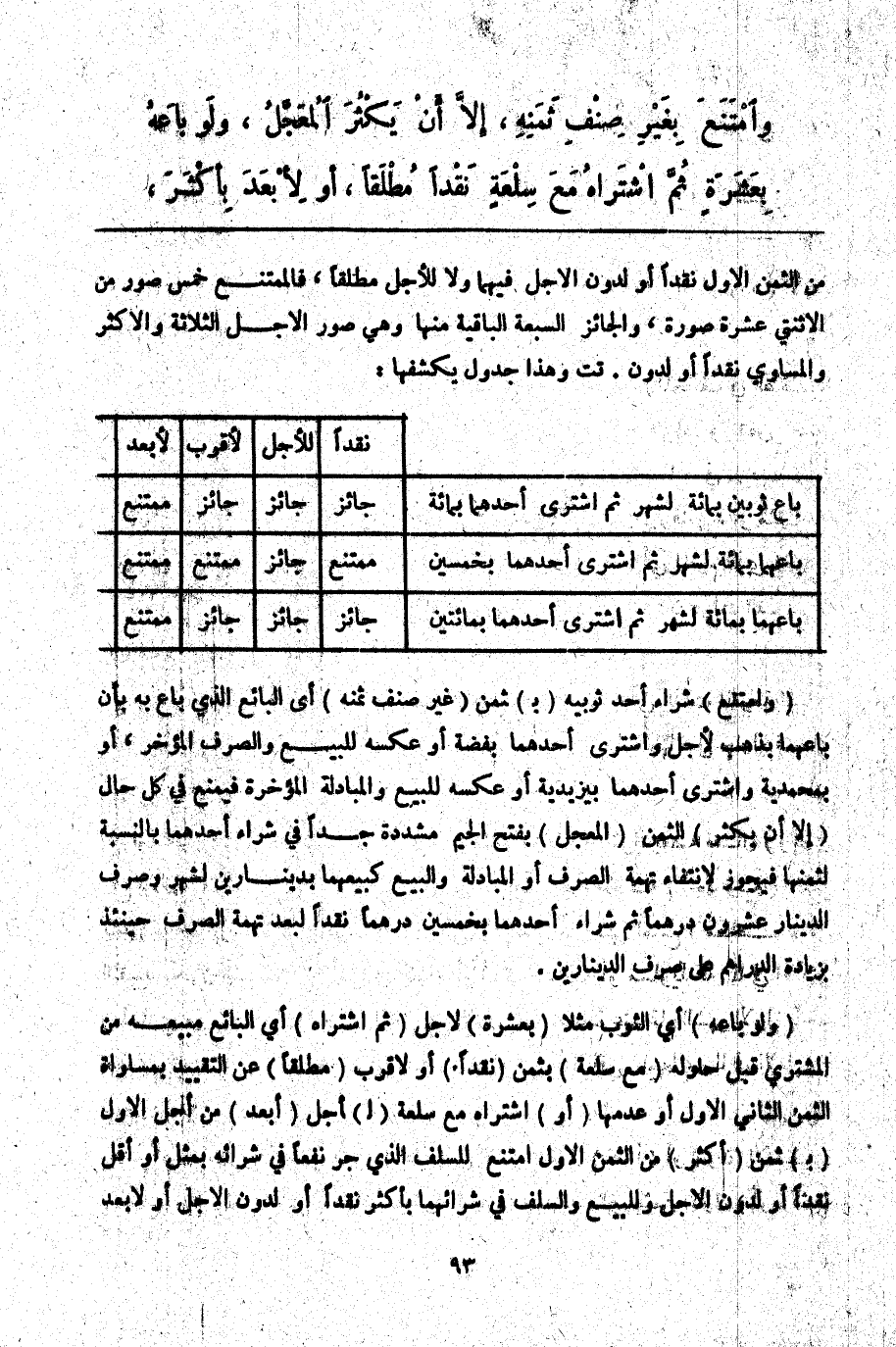 ـــــــــــــــــــــــــــــQمِنْ الثَّمَنِ الْأَوَّلِ نَقْدًا أَوْ لِدُونِ الْأَجَلِ فِيهِمَا وَلَا لِلْأَجَلِ مُطْلَقًا، فَالْمُمْتَنِعُ خَمْسُ صُوَرٍ مِنْ الِاثْنَتَيْ عَشْرَةَ صُورَةً، وَالْجَائِزُ السَّبْعَةُ الْبَاقِيَةُ مِنْهَا وَهِيَ صُوَرُ الْأَجَلِ الثَّلَاثَةِ وَالْأَكْثَرُ وَالْمُسَاوِي نَقْدًا أَوْ لِدُونِ. تت وَهَذَا جَدْوَلٌ يَكْشِفُهَا: | نَقْدًا | لِلْأَجَلِ | لِأَقْرَبَ | لِأَبْعَدَ | | | | بَاعَ ثَوْبَيْنِ بِمِائَةٍ لِشَهْرٍ ثُمَّ اشْتَرَى أَحَدَهُمَا بِمِائَةٍ | جَائِزٌ | جَائِزٌ | جَائِزٌ | مُمْتَنِعٌ | | | | | بَاعَهُمَا بِمِائَةٍ لِشَهْرٍ ثُمَّ اشْتَرَى أَحَدَهُمَا بِخَمْسِينَ | مُمْتَنِعٌ | جَائِزٌ | مُمْتَنِعٌ | مُمْتَنِعٌ | | | | | بَاعَهُمَا بِمِائَةٍ لِشَهْرٍ ثُمَّ اشْتَرَى أَحَدَهُمَا بِمِائَتَيْنِ | جَائِزٌ | جَائِزٌ | جَائِزٌ | مُمْتَنِعٌ | | | |.