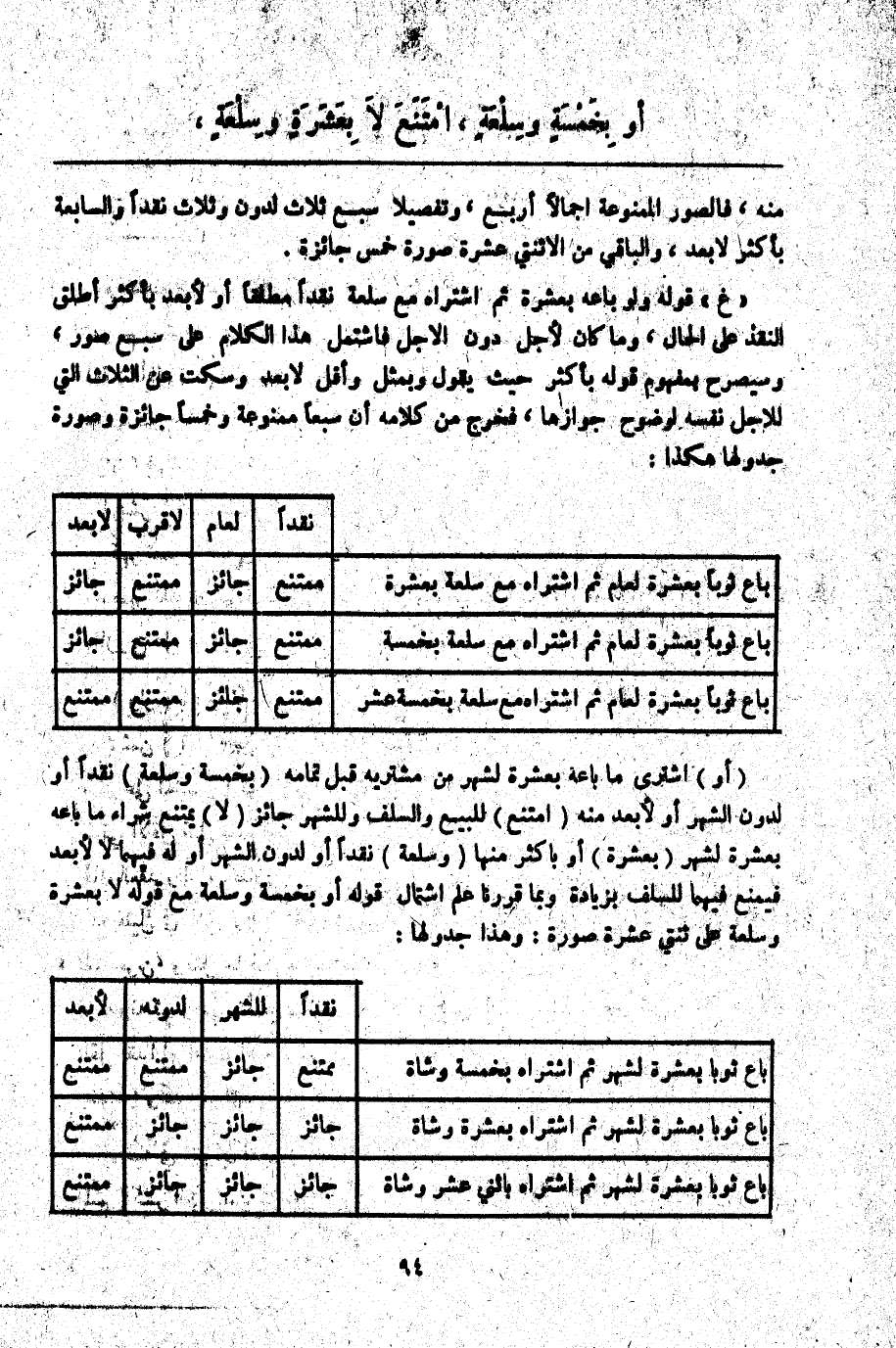 (أَوْ) اشْتَرَى مَا بَاعَهُ بِعَشَرَةٍ لِشَهْرٍ مِنْ مُشْتَرِيهِ قَبْلَ تَمَامِهِ (بِخَمْسَةٍ وَسِلْعَةٍ) نَقْدًا أَوْ لِدُونِ الشَّهْرِ أَوْ لِأَبْعَدَ مِنْهُ (امْتَنَعَ) لِلْبَيْعِ وَالسَّلَفِ وَلِلشَّهْرِ جَائِزٌ (لَا) يَمْتَنِعُ شِرَاءُ مَا بَاعَهُ بِعَشَرَةٍ لِشَهْرٍ (بِعَشَرَةٍ) أَوْ بِأَكْثَرَ مِنْهَا (وَسِلْعَةٍ) نَقْدًا أَوْ لِدُونِ الشَّهْرِ أَوْ لَهُ فِيهِمَا لَا لِأَبْعَدَ فَيُمْنَعُ فِيهِمَا لِلسَّلَفِ بِزِيَادَةٍ وَبِمَا قَرَّرْنَا عُلِمَ اشْتِمَالُ قَوْلِهِ أَوْ بِخَمْسَةٍ وَسِلْعَةٍ مَعَ قَوْلِهِ لَا بِعَشَرَةٍ وَسِلْعَةٍ عَلَى ثِنْتَيْ عَشْرَةَ صُورَةً: وَهَذَا جَدْوَلُهَا: | نَقْدًا | لِلشَّهْرِ | لِدُونِهِ | لِأَبْعَدَ | | | | بَاعَ ثَوْبًا بِعَشَرَةٍ لِشَهْرٍ ثُمَّ اشْتَرَاهُ بِخَمْسَةٍ وَشَاةٍ | مُمْتَنِعٌ | جَائِزٌ | مُمْتَنِعٌ | مُمْتَنِعٌ | | | | | بَاعَ ثَوْبًا بِعَشَرَةٍ لِشَهْرٍ ثُمَّ اشْتَرَاهُ بِعَشَرَةٍ وَشَاةٍ | جَائِزٌ | جَائِزٌ | جَائِزٌ | مُمْتَنِعٌ | | | | | بَاعَ ثَوْبًا بِعَشَرَةٍ لِشَهْرٍ ثُمَّ اشْتَرَاهُ بِاثْنَيْ عَشَرَ وَشَاةٍ | جَائِزٌ | جَائِزٌ | جَائِزٌ | مُمْتَنِعٌ | | | |