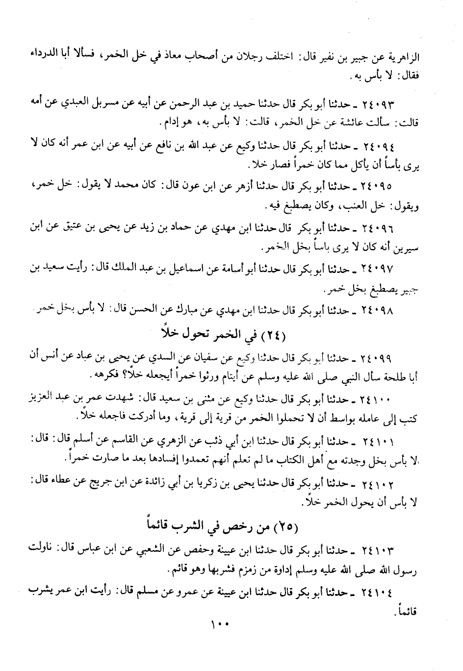 24094 - حَدَّثَنَا أَبُو بَكْرٍ قَالَ: حَدَّثَنَا وَكِيعٌ، عَنْ عَبْدِ اللَّهِ بْنِ نَافِعٍ، عَنْ أَبِيهِ، عَنِ ابْنِ عُمَرَ: «أَنَّهُ كَانَ §لَا يَرَى بَأْسًا أَنْ يَأْكُلَ مِمَّا كَانَ خَمْرًا فَصَارَ خَلًّا»
