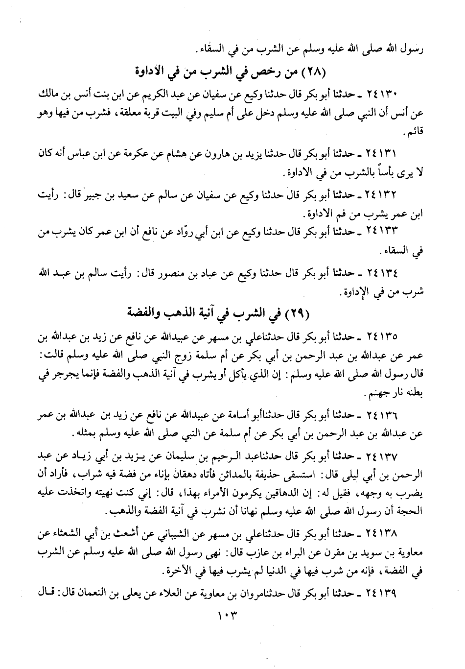24138 - حَدَّثَنَا أَبُو بَكْرٍ قَالَ: حَدَّثَنَا عَلِيُّ بْنُ مُسْهِرٍ، عَنِ الشَّيْبَانِيِّ، عَنْ أَشْعَثَ بْنِ أَبِي الشَّعْثَاءِ، عَنْ مُعَاوِيَةَ بْنِ سُوَيْدِ بْنِ مُقَرِّنٍ، عَنِ الْبَرَاءِ بْنِ عَازِبٍ، قَالَ: «§نَهَى رَسُولُ اللَّهِ صَلَّى اللهُ عَلَيْهِ وَسَلَّمَ عَنِ الشُّرْبِ فِي الْفِضَّةِ، فَإِنَّهُ مَنْ شَرِبَ فِيهَا فِي الدُّنْيَا لَمْ يَشْرَبْ فِيهَا فِي الْآخِرَةِ»