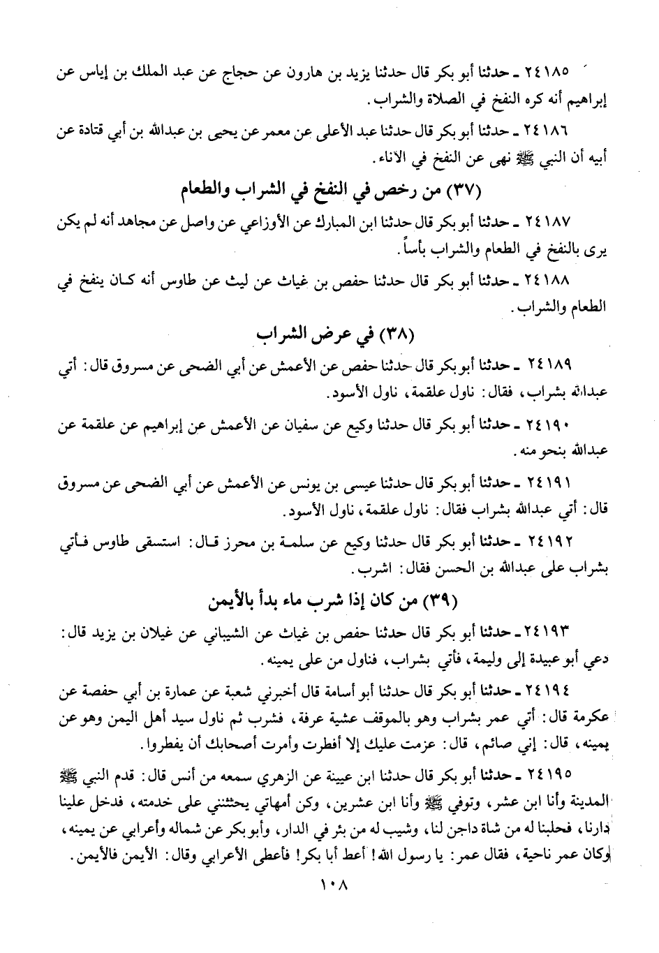 24193 - حَدَّثَنَا أَبُو بَكْرٍ قَالَ: حَدَّثَنَا حَفْصُ بْنُ غِيَاثٍ، عَنِ الشَّيْبَانِيِّ، عَنْ غَيْلَانَ بْنِ يَزِيدَ، قَالَ: «§دُعِيَ أَبُو عُبَيْدَةَ إِلَى وَلِيمَةٍ، فَأُتِيَ بِشَرَابٍ، فَنَاوَلَ مَنْ عَلَى يَمِينِهِ»