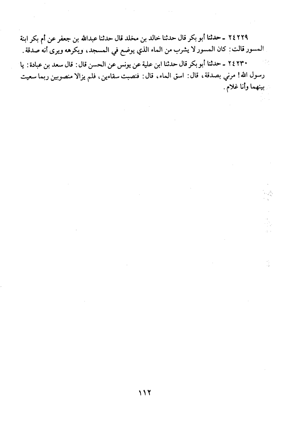 24229 - حَدَّثَنَا أَبُو بَكْرٍ قَالَ: حَدَّثَنَا خَالِدُ بْنُ مَخْلَدٍ، قَالَ: حَدَّثَنَا عَبْدُ اللَّهِ بْنُ جَعْفَرٍ، عَنْ أُمِّ بَكْرٍ ابْنَةِ الْمِسْوَرِ، قَالَتْ: «كَانَ §الْمِسْوَرُ لَا يَشْرَبُ مِنَ الْمَاءِ الَّذِي يُوضَعُ فِي الْمَسْجِدِ، وَيَكْرَهُهُ، وَيَرَى أَنَّهُ صَدَقَةٌ»