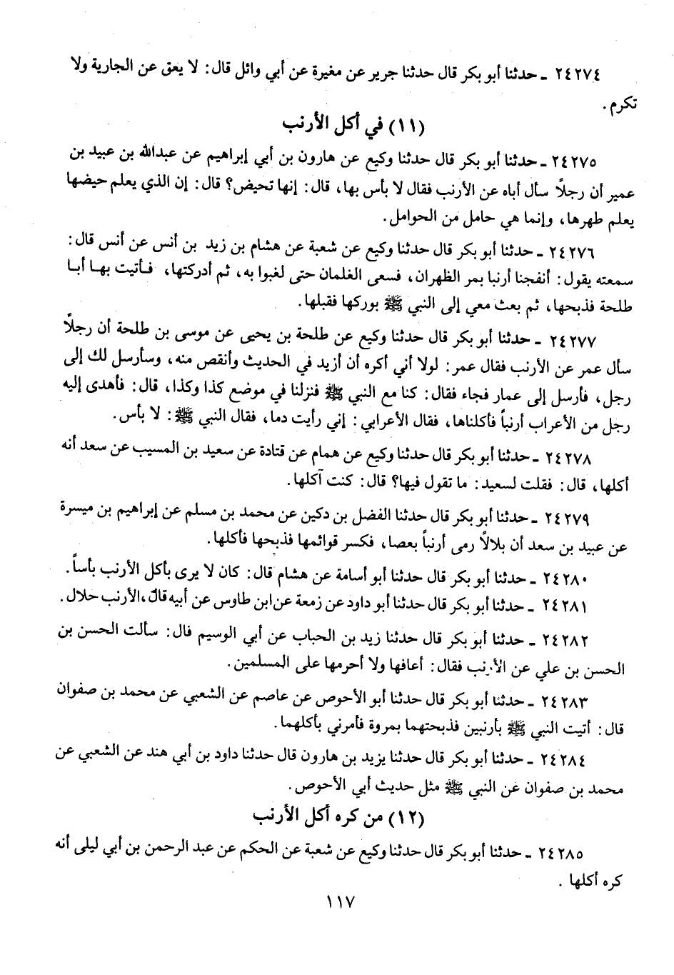 24280 - حَدَّثَنَا أَبُو بَكْرٍ قَالَ: حَدَّثَنَا أَبُو أُسَامَةَ، عَنْ هِشَامٍ، قَالَ: «كَانَ §لَا يَرَى بِأَكْلِ الْأَرْنَبِ بَأْسًا»