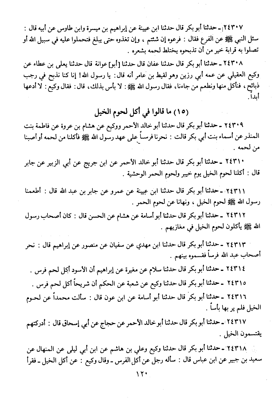 24318 - حَدَّثَنَا أَبُو بَكْرٍ قَالَ: حَدَّثَنَا وَكِيعٌ، وَعَلِيُّ بْنُ هَاشِمٍ، عَنِ ابْنِ أَبِي لَيْلَى، عَنِ الْمِنْهَالِ، عَنْ سَعِيدِ بْنِ جُبَيْرٍ، عَنِ ابْنِ عَبَّاسٍ، قَالَ: سَأَلَهُ رَجُلٌ §عَنْ أَكْلِ الْفَرَسِ، - وَقَالَ وَكِيعٌ: عَنْ أَكْلِ الْخَيْلِ -، فَقَرَأَ هَذِهِ الْآيَةَ: {وَالْأَنْعَامَ خَلَقَهَا لَكُمْ فِيهَا دِفْءٌ} [النحل: 5] الْآيَةَ قَالَ: «فَكَرِهَهَا»