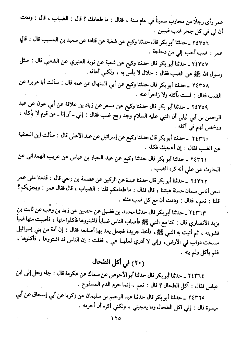 24360 - حَدَّثَنَا أَبُو بَكْرٍ قَالَ: حَدَّثَنَا وَكِيعٌ، عَنْ إِسْرَائِيلَ، عَنْ عَبْدِ الْأَعْلَى، قَالَ: سَأَلْتُ ابْنَ الْحَنَفِيَّةِ عَنِ §الضَّبِّ، فَقَالَ: «إِنْ أَعْجَبَكَ فَكُلْهُ»