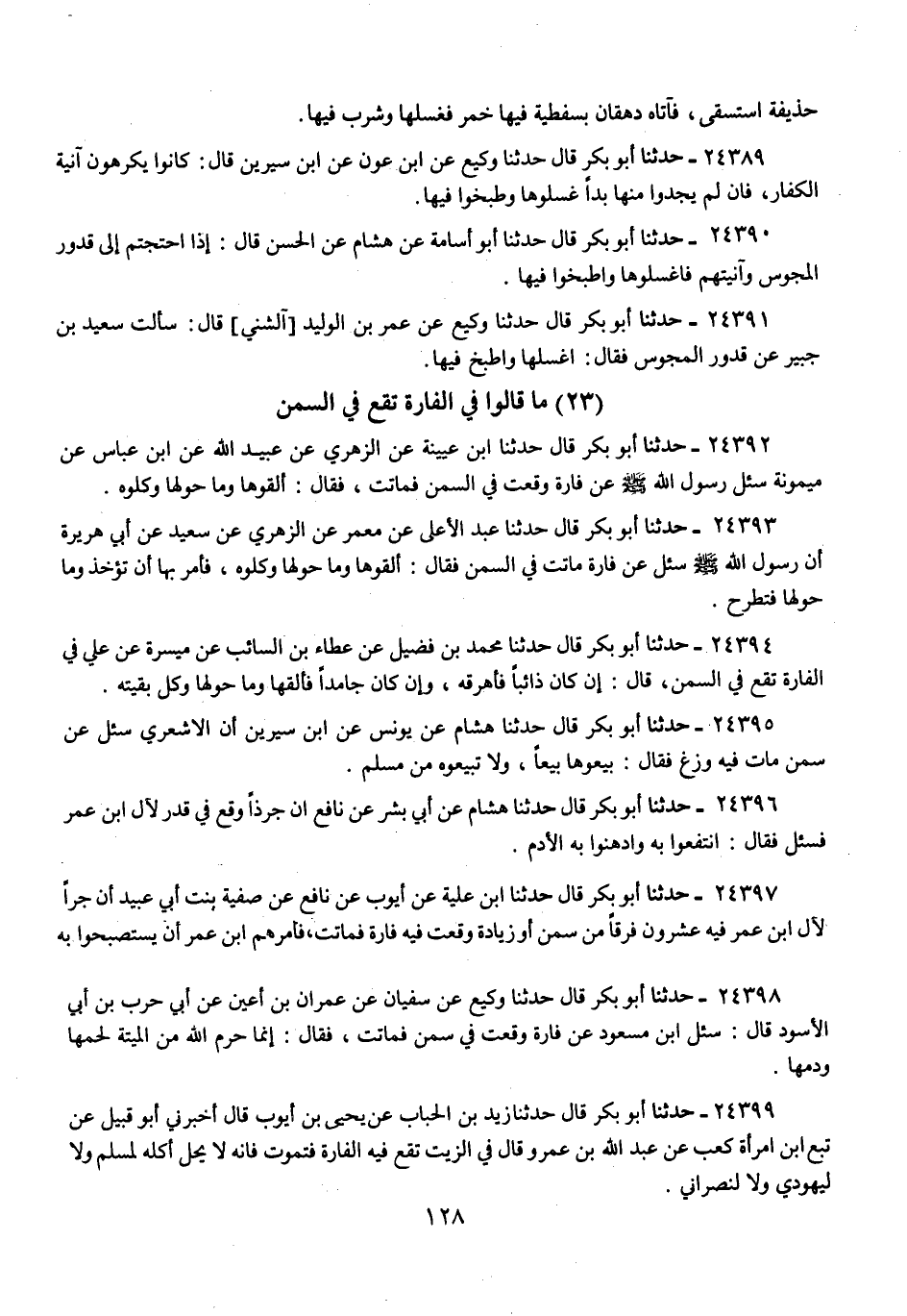 24392 - حَدَّثَنَا أَبُو بَكْرٍ قَالَ: حَدَّثَنَا ابْنُ عُيَيْنَةَ، عَنِ الزُّهْرِيِّ، عَنْ عُبَيْدِ اللَّهِ، عَنِ ابْنِ عَبَّاسٍ، عَنْ مَيْمُونَةَ سُئِلَ رَسُولُ اللَّهِ صَلَّى اللهُ عَلَيْهِ وَسَلَّمَ عَنْ فَأْرَةٍ وَقَعَتْ فِي السَّمْنِ فَمَاتَتْ، فَقَالَ: «§أَلْقُوهَا وَمَا حَوْلَهَا وَكُلُوهُ»