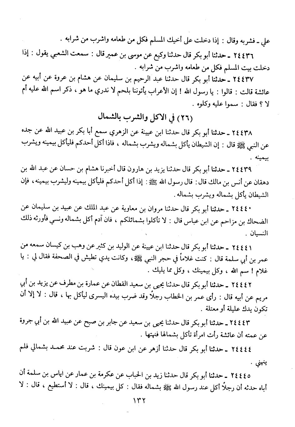 24438 - حَدَّثَنَا أَبُو بَكْرٍ قَالَ: حَدَّثَنَا ابْنُ عُيَيْنَةَ، عَنِ الزُّهْرِيِّ، سَمِعَ أَبَا بَكْرِ بْنَ عُبَيْدِ اللَّهِ، عَنْ جَدِّهِ، عَنِ النَّبِيِّ صَلَّى اللهُ عَلَيْهِ وَسَلَّمَ قَالَ: «§إِنَّ الشَّيْطَانَ يَأْكُلُ بِشِمَالِهِ، فَإِذَا أَكَلَ أَحَدُكُمْ فَلْيَأْكُلْ بِيَمِينِهِ وَيَشْرَبْ بِيَمِينِهِ»