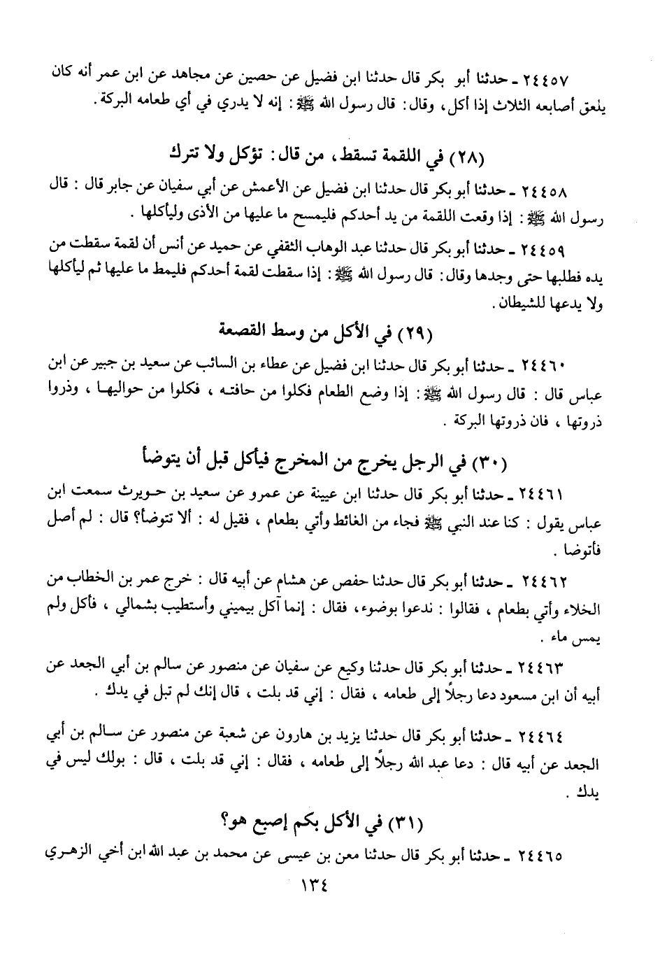 24460 - حَدَّثَنَا أَبُو بَكْرٍ قَالَ: حَدَّثَنَا ابْنُ فُضَيْلٍ، عَنْ عَطَاءِ بْنِ السَّائِبِ، عَنْ سَعِيدِ بْنِ جُبَيْرٍ، عَنِ ابْنِ عَبَّاسٍ، قَالَ: قَالَ رَسُولُ اللَّهِ صَلَّى اللهُ عَلَيْهِ وَسَلَّمَ: «§إِذَا وُضِعَ الطَّعَامُ فَكُلُوا مِنْ حَافَّتِهِ، فَكُلُوا مِنْ حَوَالَيْهَا، وَذَرُوا ذِرْوَتَهَا، فَإِنَّ ذِرْوَتَهَا الْبَرَكَةُ»