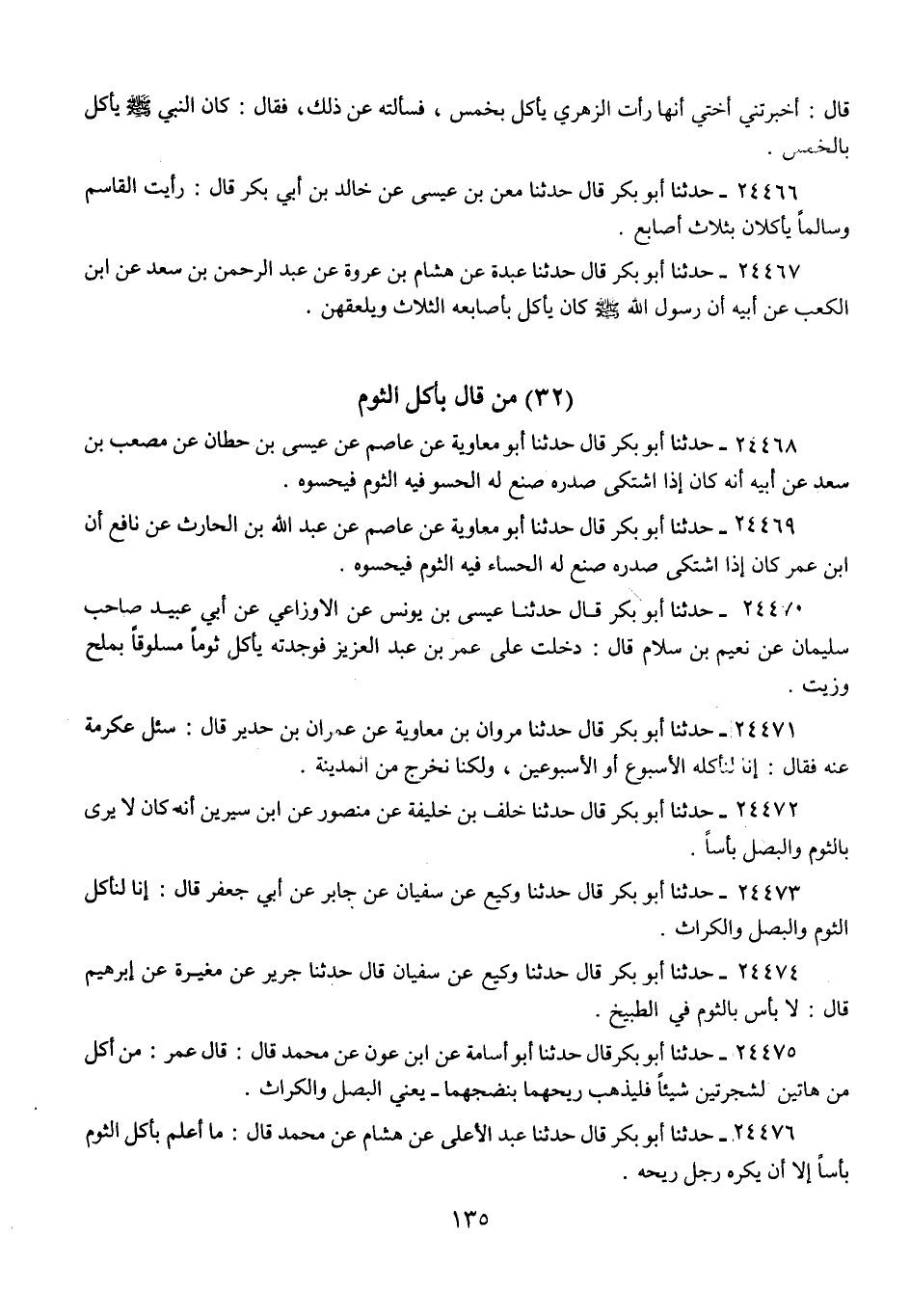 24470 - حَدَّثَنَا أَبُو بَكْرٍ قَالَ: حَدَّثَنَا عِيسَى بْنُ يُونُسَ، عَنِ الْأَوْزَاعِيِّ، عَنْ أَبِي عُبَيْدٍ صَاحِبِ سُلَيْمَانَ، عَنْ نُعَيْمِ بْنِ سَلَّامٍ، قَالَ: «دَخَلْتُ عَلَى عُمَرَ بْنِ عَبْدِ الْعَزِيزِ فَوَجَدْتُهُ §يَأْكُلُ ثُومًا مَسْلُوقًا بِمِلْحٍ وَزَيْتٍ»