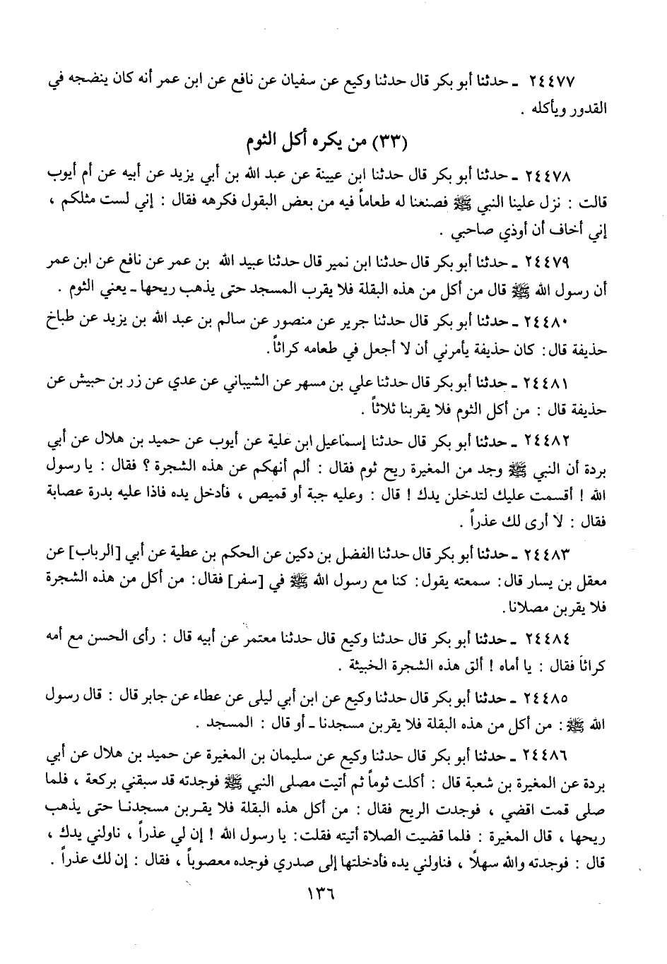 24481 - حَدَّثَنَا أَبُو بَكْرٍ قَالَ: حَدَّثَنَا عَلِيُّ بْنُ مُسْهِرٍ، عَنِ الشَّيْبَانِيِّ، عَنْ عَدِيٍّ، عَنْ زِرِّ بْنِ حُبَيْشٍ، عَنْ حُذَيْفَةَ، قَالَ: «§مَنْ أَكَلَ الثُّومَ فَلَا يَقْرَبْنَا ثَلَاثًا»