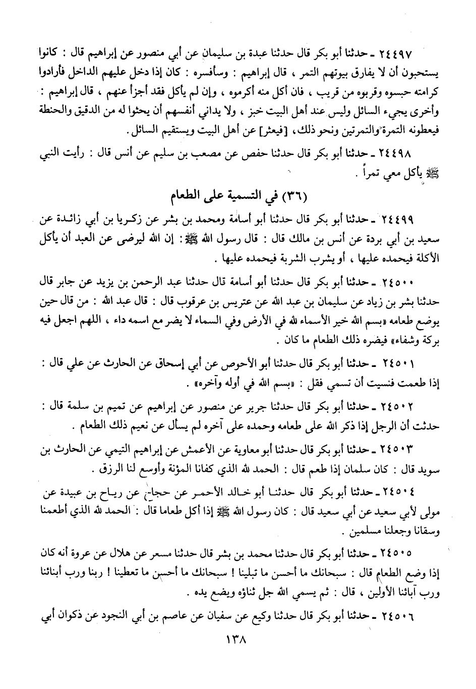 24502 - حَدَّثَنَا أَبُو بَكْرٍ قَالَ: حَدَّثَنَا جَرِيرٌ، عَنْ مَنْصُورٍ، عَنْ إِبْرَاهِيمَ، عَنْ تَمِيمِ بْنِ سَلَمَةَ، قَالَ: «حُدِّثْتُ أَنَّ الرَّجُلَ §إِذَا ذَكَرَ اللَّهَ عَلَى طَعَامِهِ وَحَمِدَهُ عَلَى آخِرِهِ، لَمْ يُسْأَلْ عَنْ نَعِيمِ ذَلِكَ الطَّعَامِ»