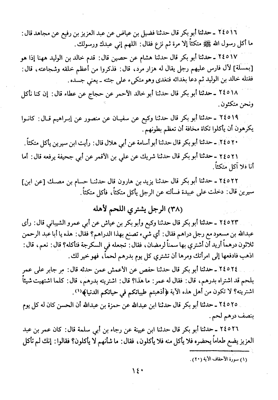 24520 - حَدَّثَنَا أَبُو بَكْرٍ قَالَ: حَدَّثَنَا أَبُو أُسَامَةَ، عَنْ أَبِي هِلَالٍ، قَالَ: «رَأَيْتُ §ابْنَ سِيرِينَ يَأْكُلُ مُتَّكِئًا»