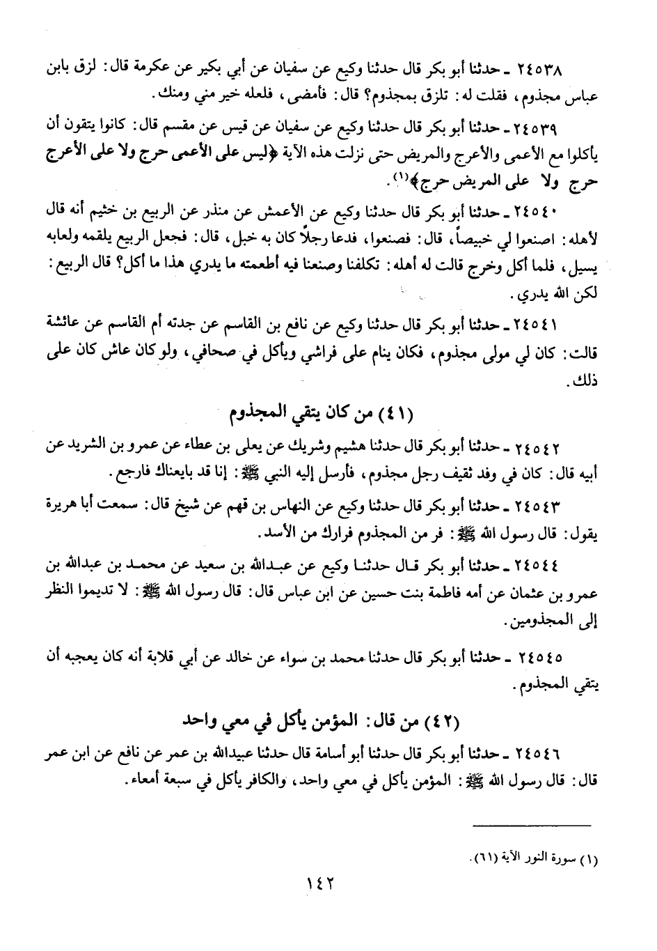 24539 - حَدَّثَنَا أَبُو بَكْرٍ قَالَ: حَدَّثَنَا وَكِيعٌ، عَنْ سُفْيَانَ، عَنْ قَيْسٍ، عَنْ مِقْسَمٍ، قَالَ: «كَانُوا §يَتَّقُونَ أَنْ يَأْكُلُوا مَعَ الْأَعْمَى وَالْأَعْرَجِ وَالْمَرِيضِ حَتَّى نَزَلَتْ هَذِهِ» الْآيَةُ: {لَيْسَ عَلَى الْأَعْمَى حَرَجٌ وَلَا عَلَى الْأَعْرَجِ حَرَجٌ وَلَا عَلَى الْمَرِيضِ حَرَجٌ} [النور: 61]