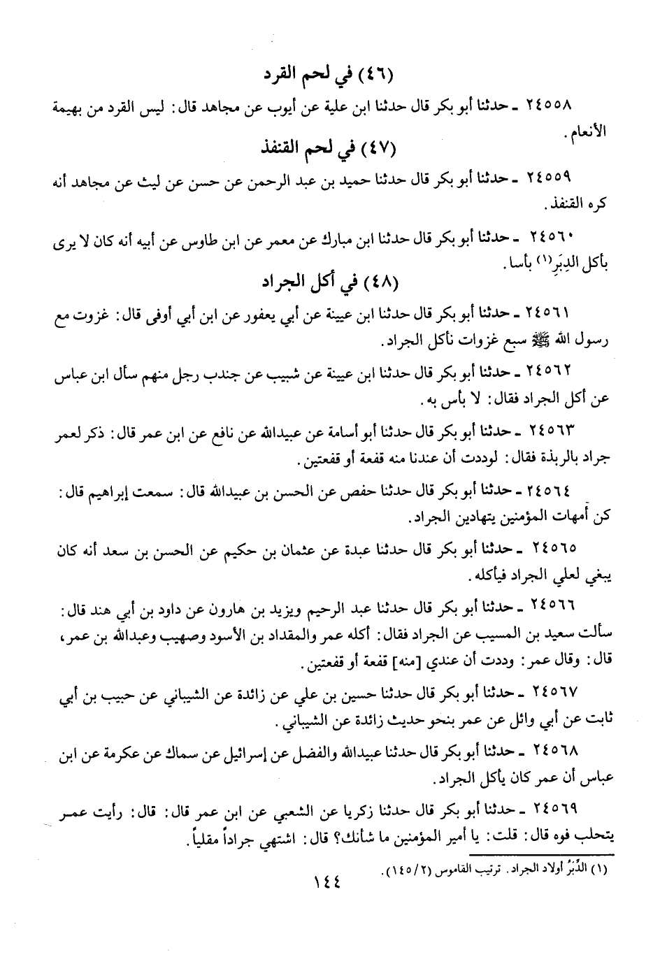 24566 - حَدَّثَنَا أَبُو بَكْرٍ قَالَ: حَدَّثَنَا عَبْدُ الرَّحِيمِ، وَيَزِيدُ بْنُ هَارُونَ، عَنْ دَاوُدَ بْنِ أَبِي هِنْدٍ، قَالَ: سَأَلْتُ سَعِيدَ بْنَ الْمُسَيِّبِ عَنِ §الْجَرَادِ، فَقَالَ: أَكَلَهُ عُمَرُ، وَالْمِقْدَادُ بْنُ الْأَسْوَدِ، وَصُهَيْبٌ، وَعَبْدُ اللَّهِ بْنُ عُمَرَ، قَالَ: وَقَالَ عُمَرُ: «وَدِدْتُ أَنَّ عِنْدِي قَفْعَةً، أَوْ قَفْعَتَيْنِ»