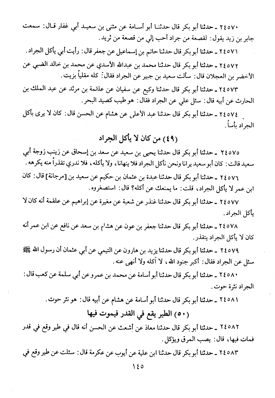 24577 - حَدَّثَنَا أَبُو بَكْرٍ قَالَ: حَدَّثَنَا غُنْدَرٌ، عَنْ شُعْبَةَ، عَنْ مُغِيرَةَ، عَنْ إِبْرَاهِيمَ، عَنْ عَلْقَمَةَ: «§أَنَّهُ كَانَ لَا يَأْكُلُ الْجَرَادَ»