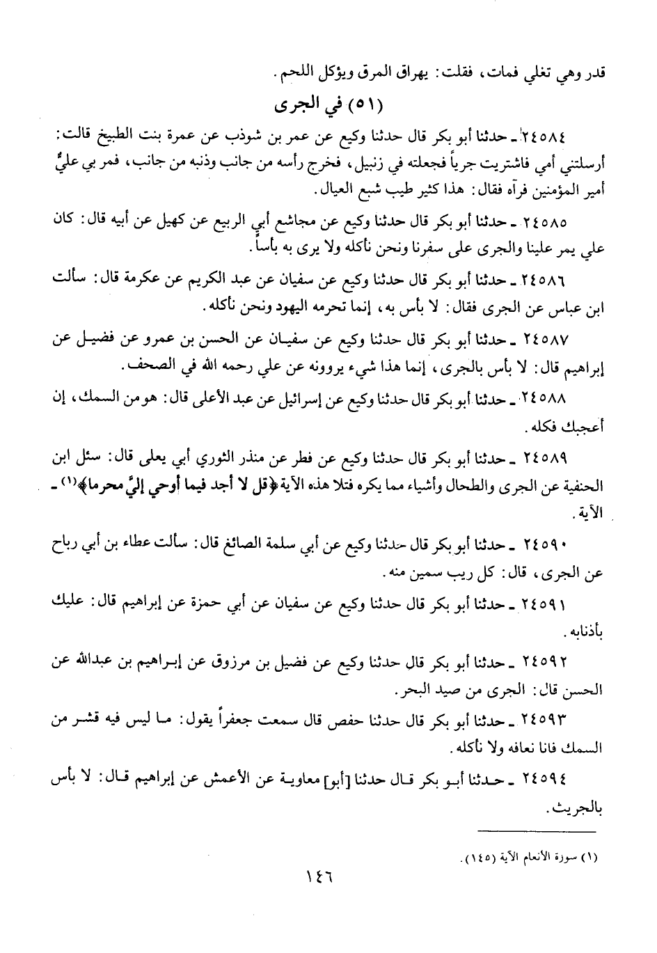 24589 - حَدَّثَنَا أَبُو بَكْرٍ قَالَ: حَدَّثَنَا وَكِيعٌ، عَنْ فِطْرٍ، عَنْ مُنْذِرٍ الثَّوْرِيِّ أَبِي يَعْلَى، قَالَ: «سُئِلَ ابْنُ الْحَنَفِيَّةِ عَنِ الْجَرِّيِّ، وَالطِّحَالِ، وَأَشْيَاءَ مِمَّا يُكْرَهُ فَتَلَا هَذِهِ» الْآيَةَ: {§قُلْ لَا أَجِدُ فِي مَا أُوحِيَ إِلَيَّ مُحَرَّمًا} [الأنعام: 145] الْآيَةَ
