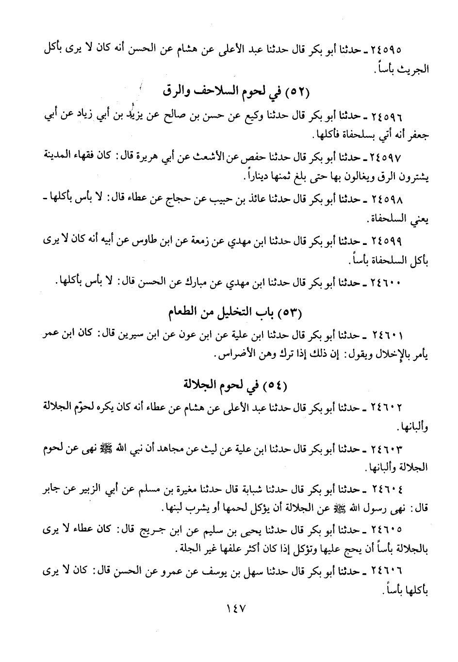 24606 - حَدَّثَنَا أَبُو بَكْرٍ قَالَ: حَدَّثَنَا سَهْلُ بْنُ يُوسُفَ، عَنْ عَمْرٍو، عَنِ الْحَسَنِ، قَالَ: «كَانَ §لَا يَرَى بِأَكْلِهَا بَأْسًا»